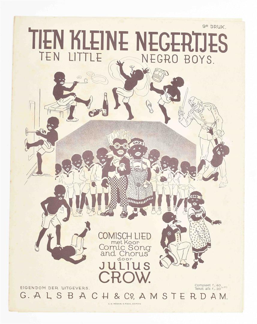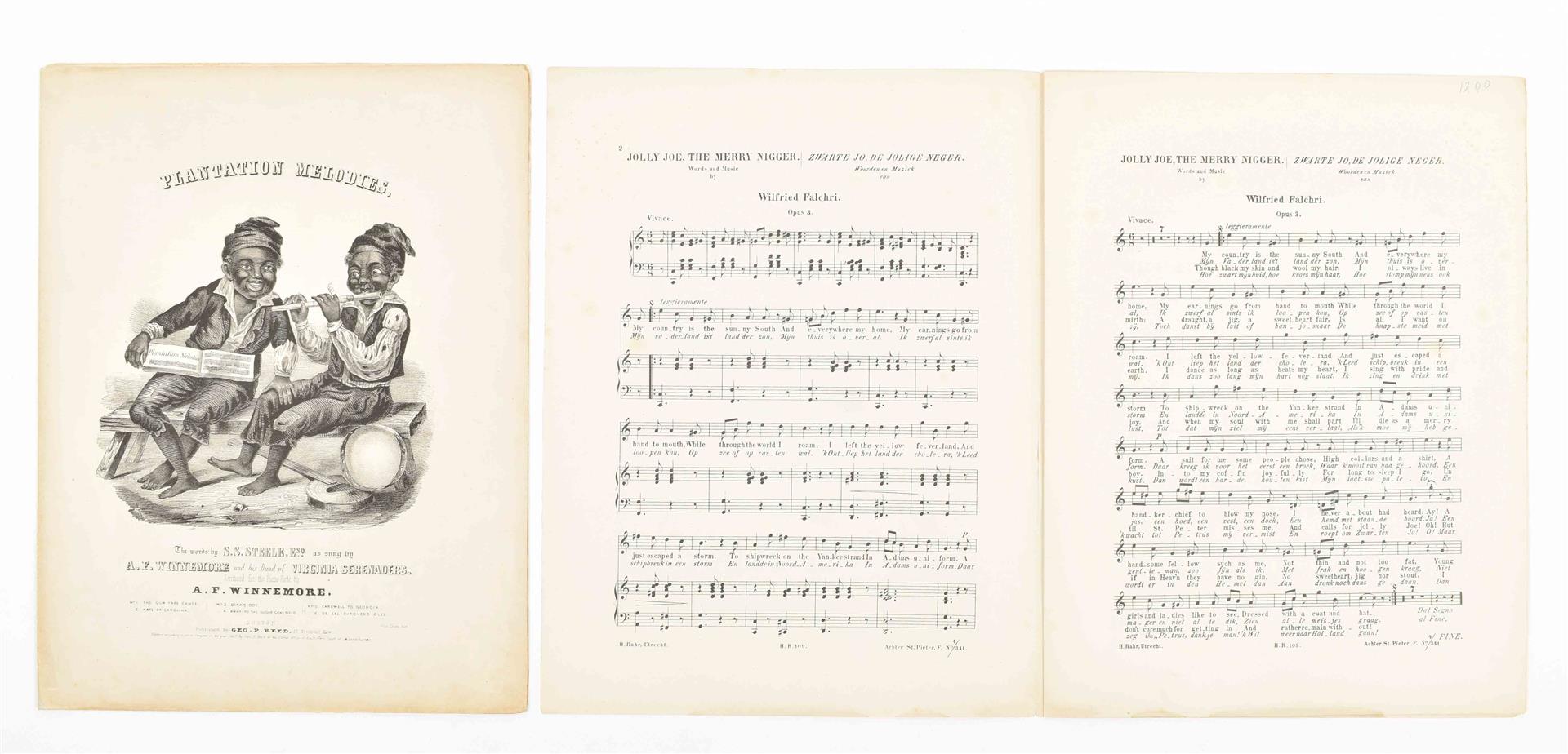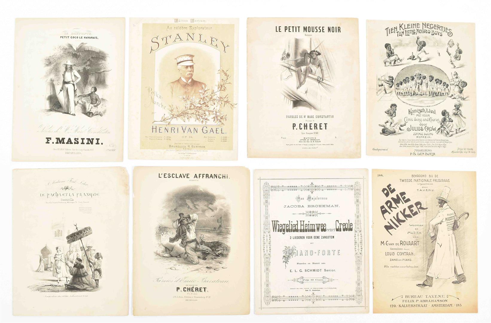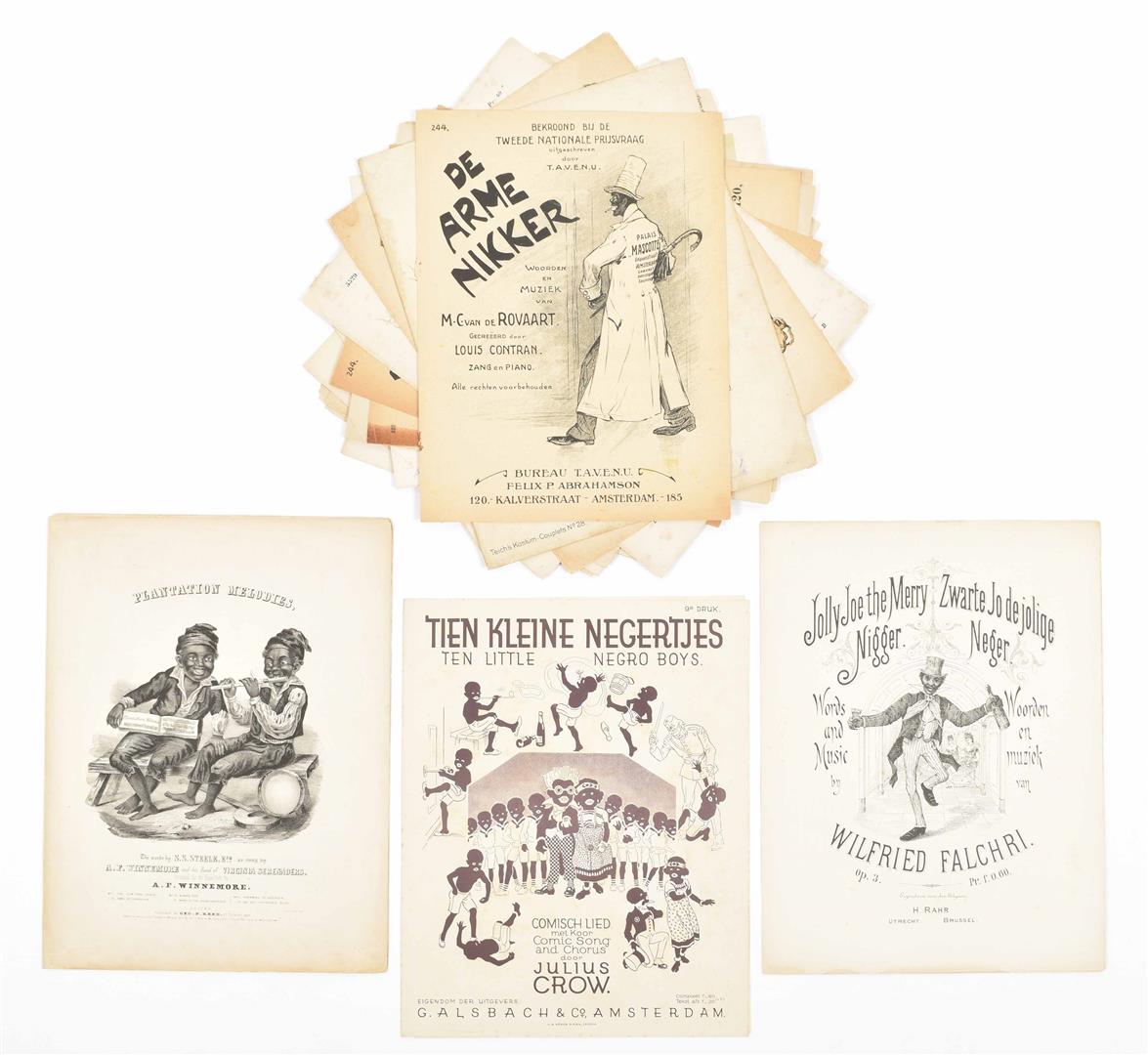 Late 19th/ early 20th cent. Comprises a.o.: (1) Plantation melodies (Away to the sugar cane field). The words by S.S. Steele, Esq. as sung by A.F. Winnemore (...). Boston, G.F. Reed, 1847, lithogr. title, 2 p. score and 1 p. of text. Sm. imperfections. (2) Aan Mejuffrouw Jacoba Broekman. Wiegelied, Heimwee eener Creole. 2 liederen voor enne zangstem met piano-forte. Woorden en muziek van E.L.G. Schmidt Senior. Amst., G. Alexandre, (ca. 1880), 6 lithogr. p. (stamp on title-p.). Very rare, no other copies traced. (3) L'esclave affranchi. Paroles d'Emile Barateau, musique de P. Chéret. No. 5, 9e. année. Brussels, Libeau, (ca. 1860), bifolium w. lithogr. title and 2 p. score (reattached w. tape). -and 2 similar scores by Cheret. (4) Jolly Joe the Merry Nigger. Zwarte Jo de Jolige Neger. Words and Music by Wilfried Falchri. Utrecht/ Brussels, H. Rahr, (ca. 1880), 6 lithogr. p., text in English and Dutch. (5-6) Tien Kleine Negertjes. Ten Little Negro Boys. Komisch lied met koor (...) door Julius Crow. 2 different eds., Middelburg, F.B. den Boer, (ca. 1900)/ Amst., G. Alsbach & Co, (ca. 1910), 4 and 6 p. The first w. (repaired) split on fold. (7) De arme nikker. Woorden en muziek van M.C. van de Rovaart. Amst., Bureau T.A.V.N.U., (ca. 1900), 4 p. 2 copies.