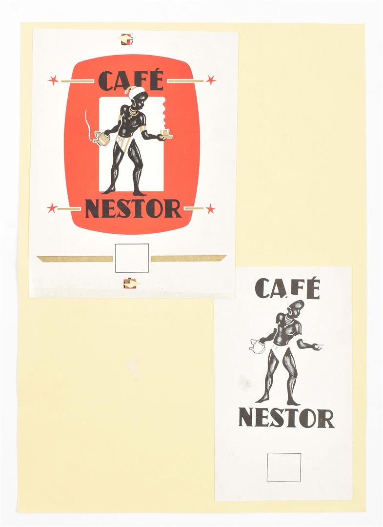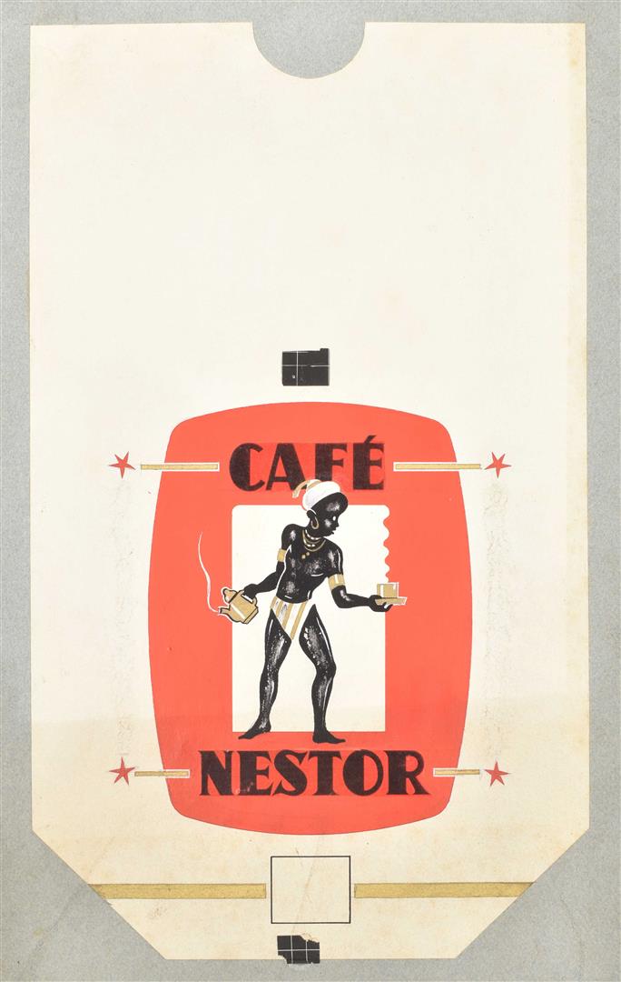 Orig. gouache design in red, gold and black for a paper coffee bag, 21 x 11 cm, signed Kalischer in red gouache, ca. 1930, mounted on cardboard w. annotations in pencil concerning the design verso. -and the coffee bag itself. (2) Idem (?). Café Nestor. Orig. gouache design in red, gold and black and w. the text printed and mounted, for a paper coffee bag, 33.5 x 20 cm, ca. 1930, mounted on cardboard. Dust soiled, w. erased lines between the stars (correction by the artist). -and a printed version of the design and a printed variant of the black parts only, tipped-on to mount. -and 2 other orig. designs in col. gouache, 1 signed Kalischer in black pen, the other probably also by him.