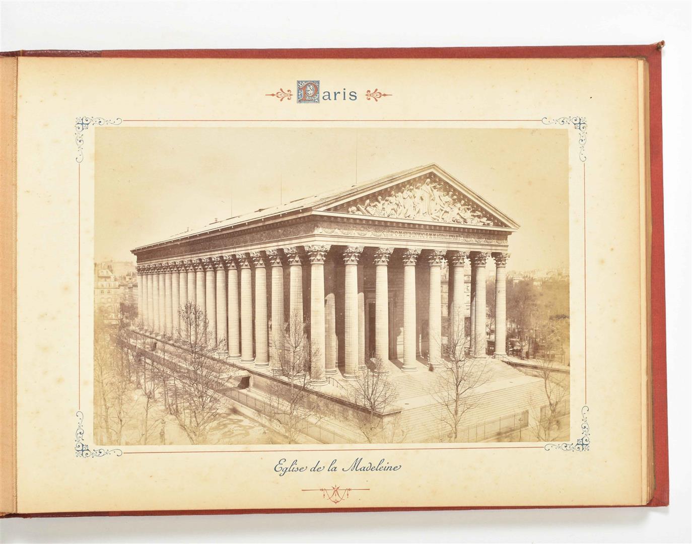 Late 19th cent. Incl. views of a.o. Place Vendôme, Notre Dame, the Louvre and many other tourist attractions, street views of a.o. Rue de Rivoli, Avenue de l'Opéra, Boulevard des Italiens, Rue du Temple and the Champs Elysées. All prints glued down and w. captions, together in a gilt half morocco album.