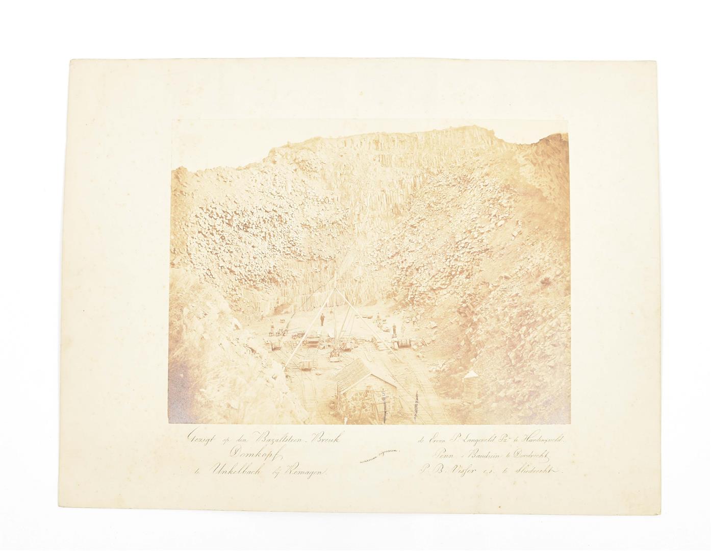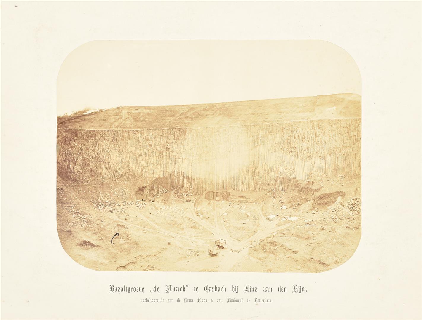 Albumen photo, ca. 1870-80. 27 x 36 cm. Subscript 'Gezigt op den Bazaltsteen-Breuk Domkop te Unkelbach bij Remagen waarvan eigenaren: De Erven P. Langeveld Pzn te Hardinxveld, Penn Baudruin te Dordrecht, P.B. Visser c.s. te Sliedrecht. Mounted on board. (2) Bazaltgroeve "De Haack" te Gasbach bij Linz aan den Rijn, toebehoordende aan de firma Kloos & van Limburgh te Rotterdam. Albumen photo, ca. 1870-80. 25.5 x 33.5 cm, mounted on board. Added: 2 albumen photos of Vienna, 2 albumen photos of Danzig and one more.