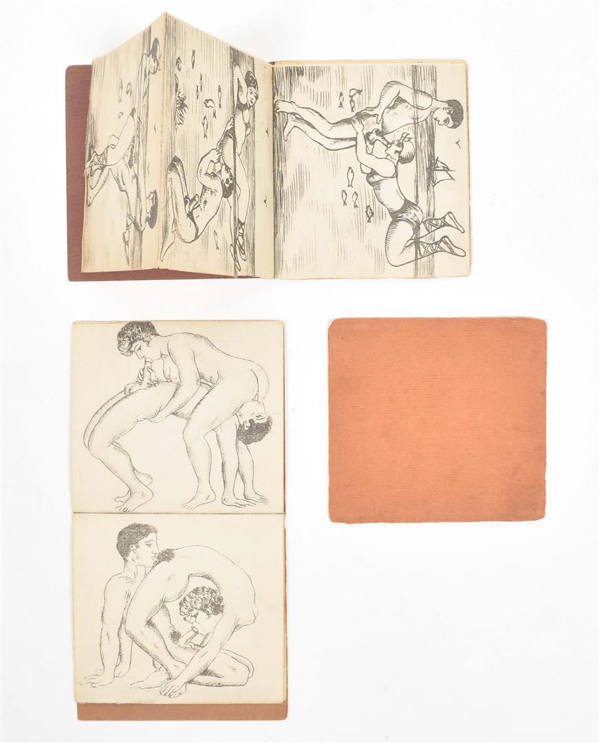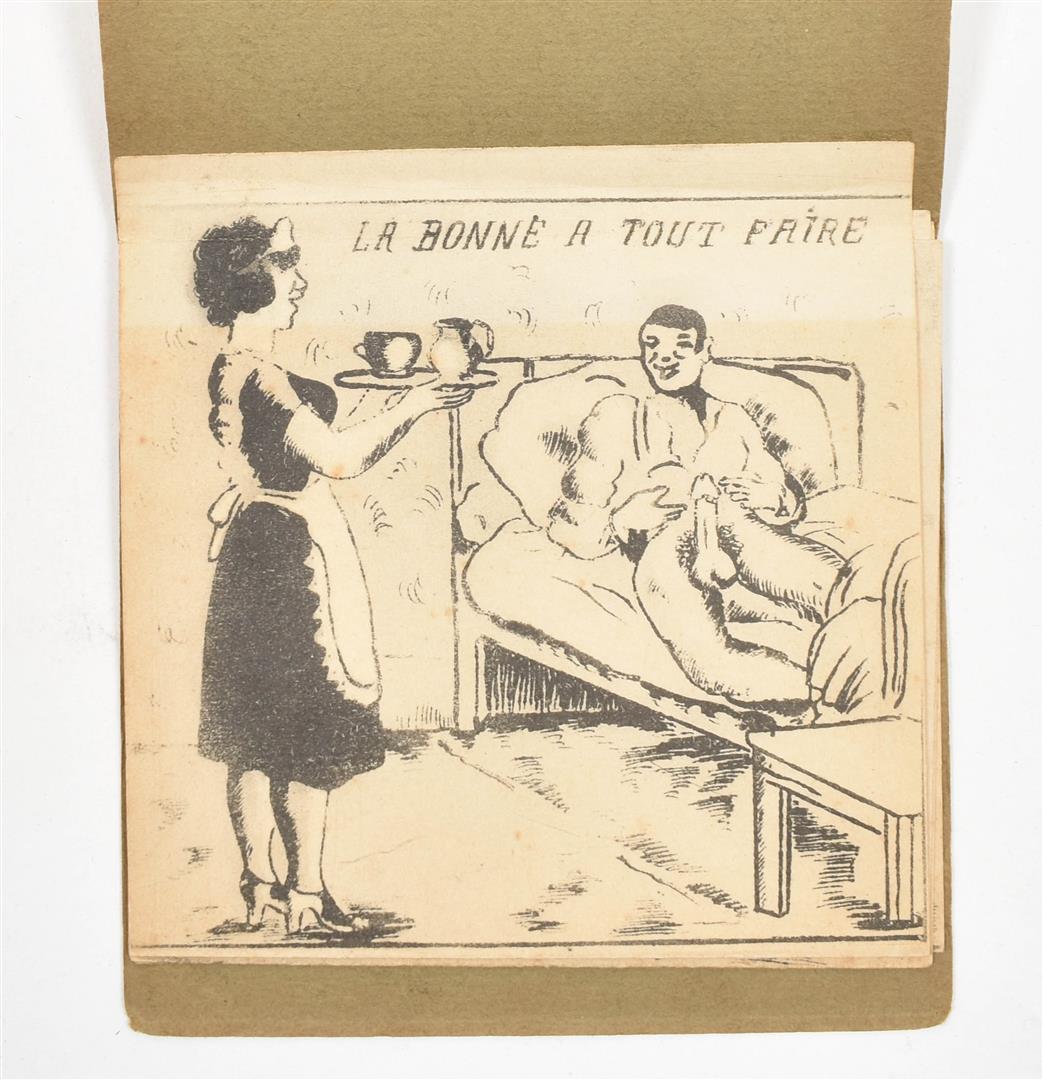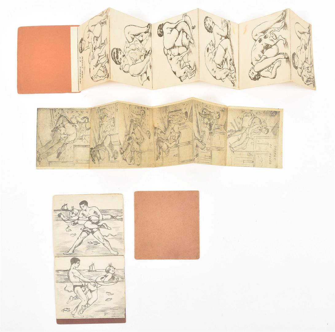 France, ca. 1920. (1) La leçon de natation. Story without text in 6 images. 53 x 10 cm. (2) Voyage de noces. Lacking cover. (3) Acrobates dernier cri. (4) Madame et... son chien. (5) La bonné a tout patré.