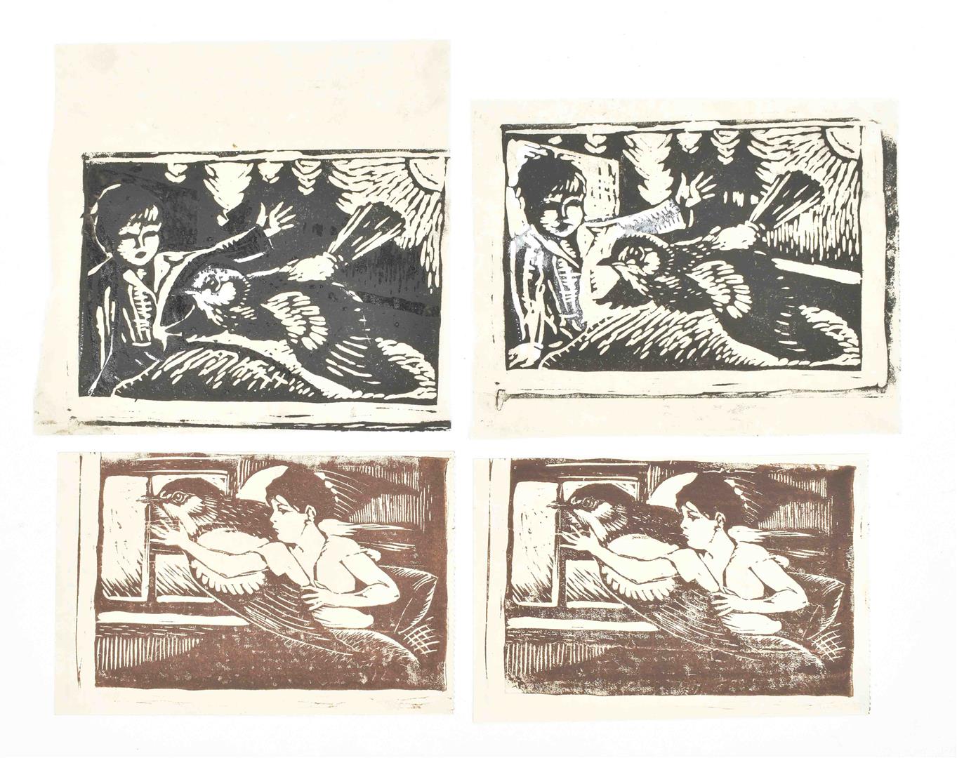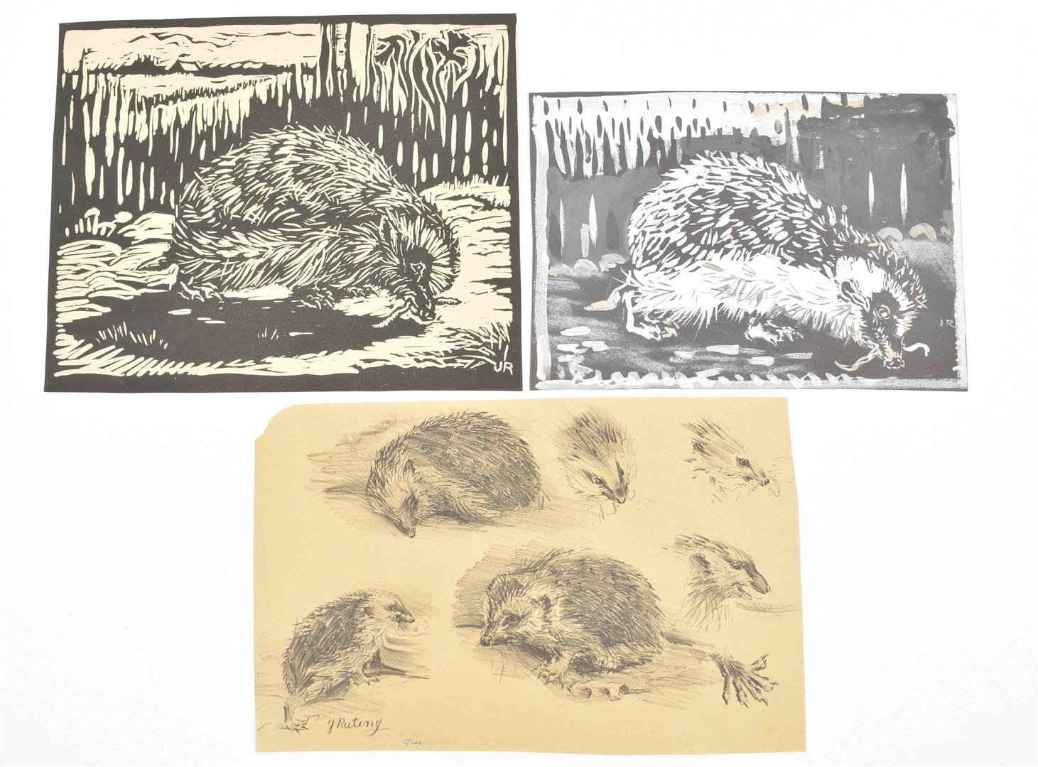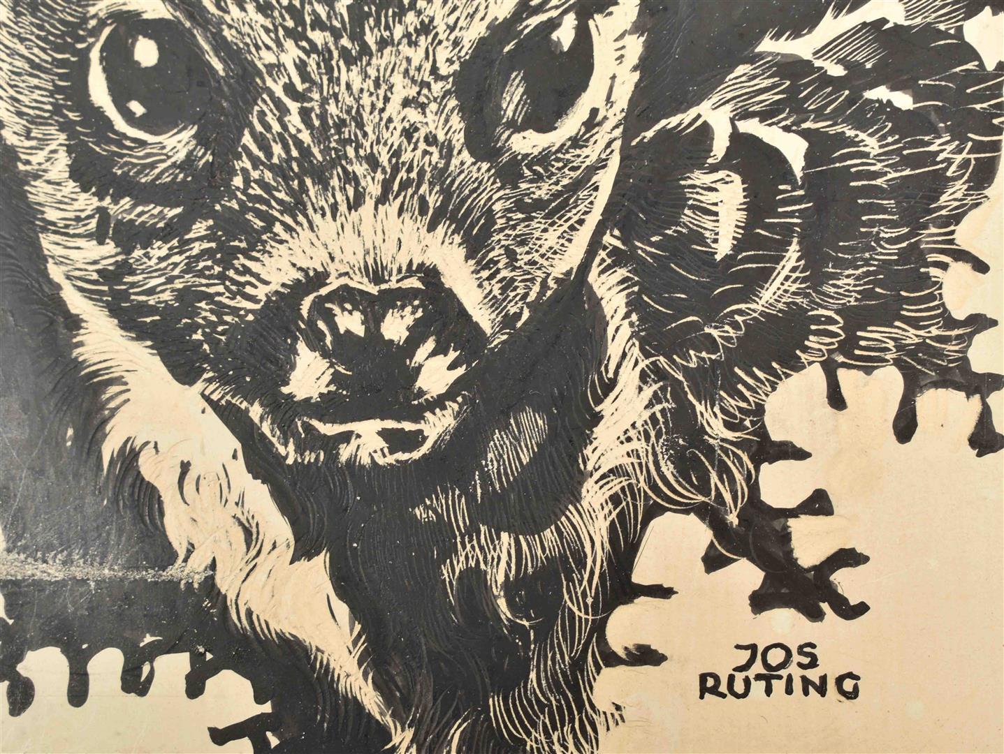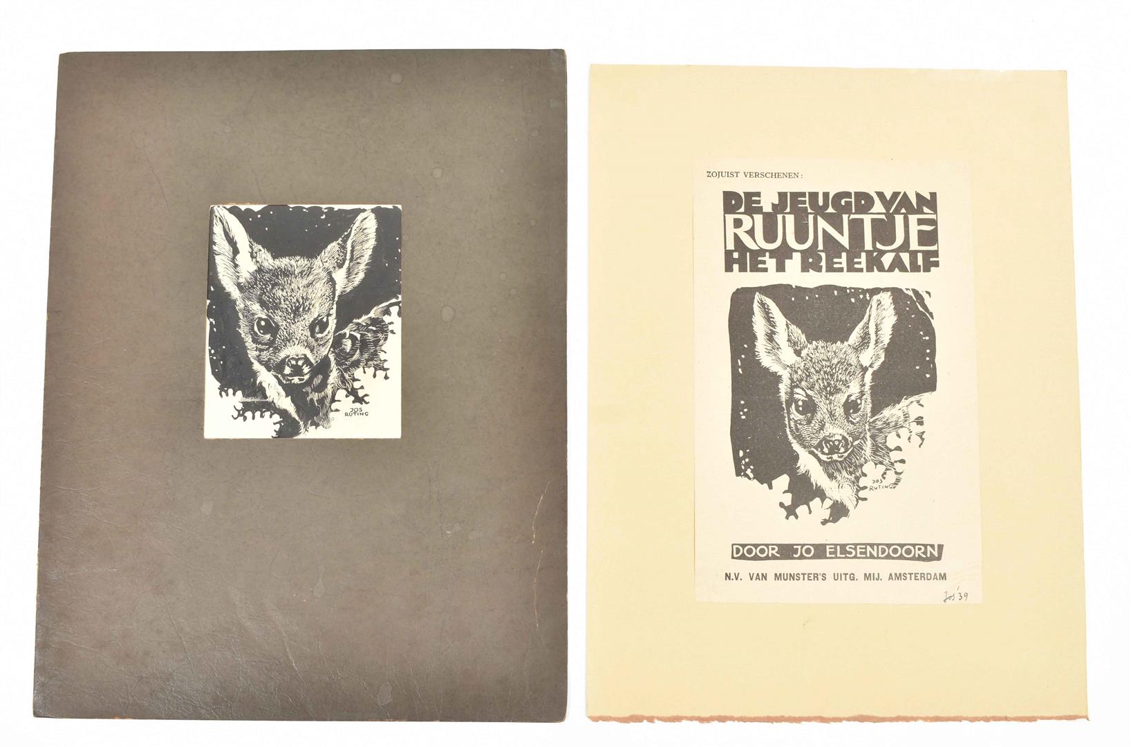 India ink, size between 5 x 6 cm and 9.5 x 13.5 cm. Added: The advertorial leaflet for the book by Jo Elsendoorn. With: (2) Fourteen linocuts. One signed, dated 1938, and 4 proofs of the same. (3) Painting of a hedgehog in b/w. 18.5 x 29 cm.