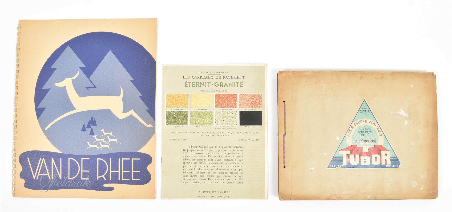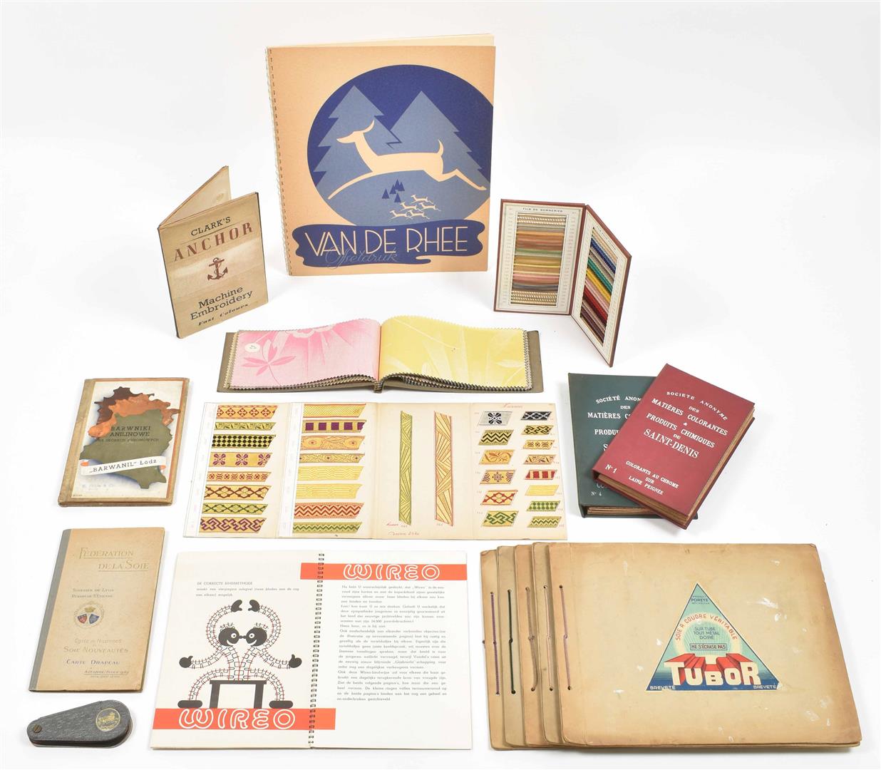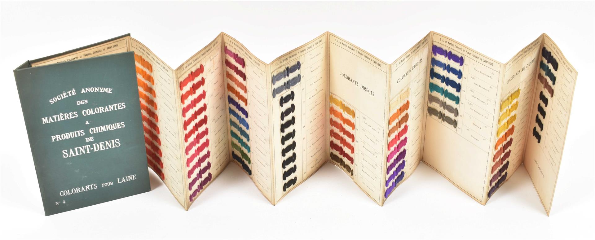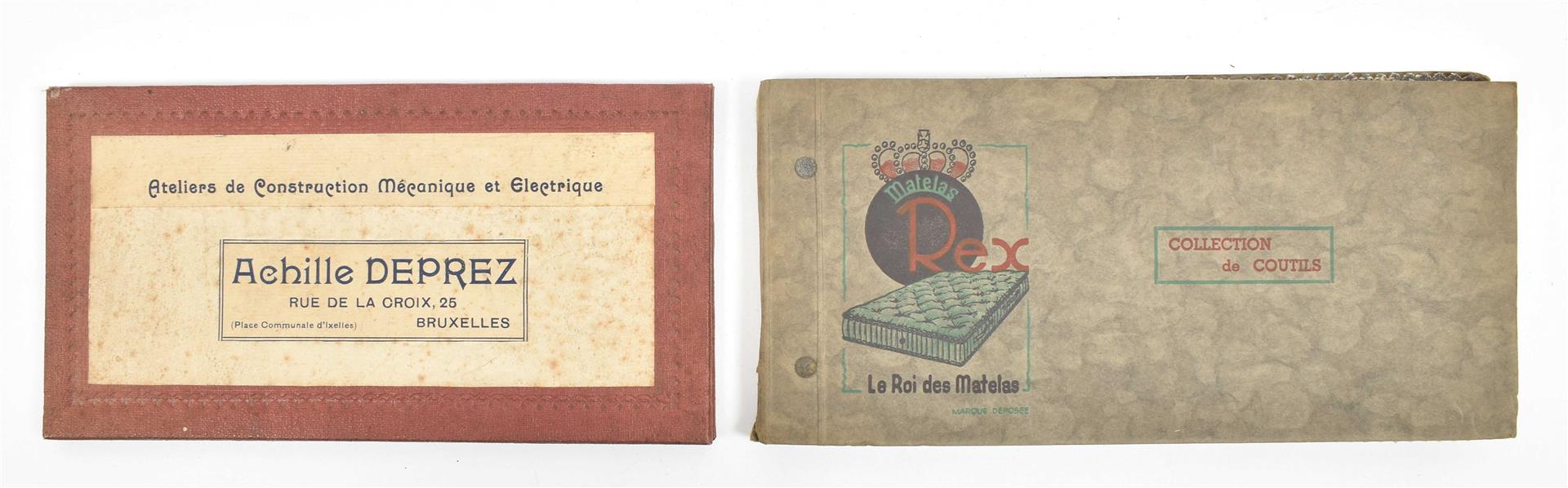 First half 20th cent. Comprises a.o.: (1) De Woerd-A.Z. Kettingkastenfabriek Barneveld. Pocket trade catalogue in the shape of a chain guard, w. 15 specimens of different materials and 6 paper advertorial lvs. (2) Ateliers de Construction Mécanique et Electrique Achille Deprez, Bruxelles. Incl. 50 samples of electric wires, 11 x 21.5 cm, folded as a booklet, ca. 1930. (3-4) Société anonyme des matières colorantes & produits chimique de Saint-Denis. No. 1. Colorants au chrome sur laine peignée. No. 4. Colorants pour laine. Sample books, both fold. leporellos w. 9/ 10 p. w. 54/ 83 mounted col. cl. samples, ca. 1920. -and 10 others, incl. a trade catalogue on leather w. mounted sample in the shape of shoes and bags.