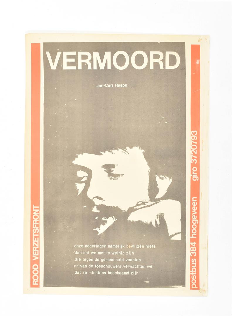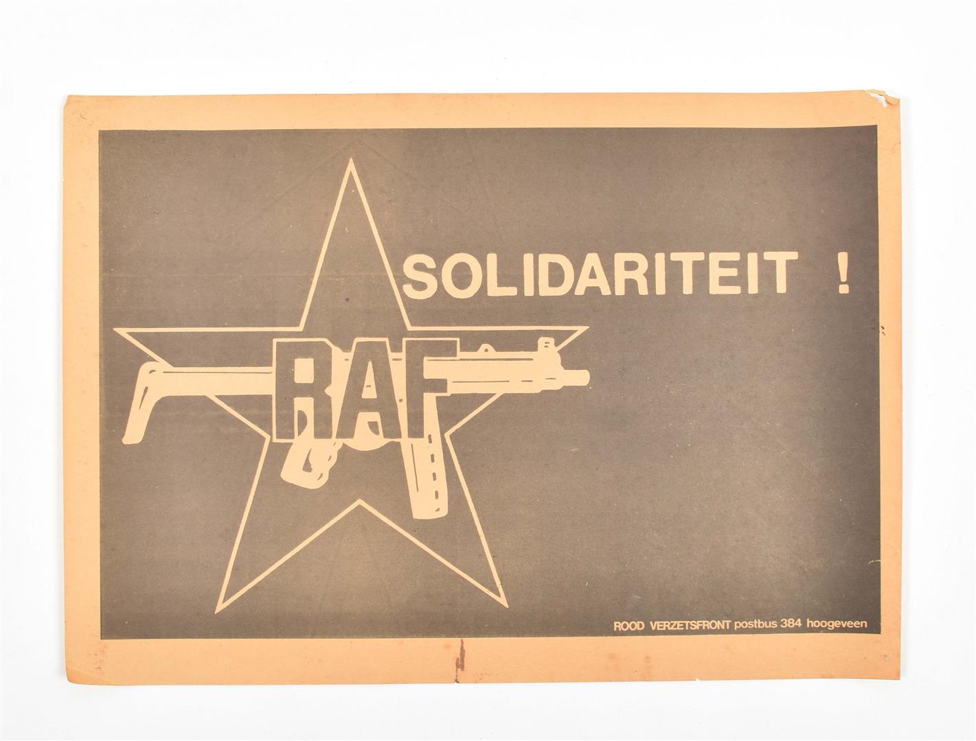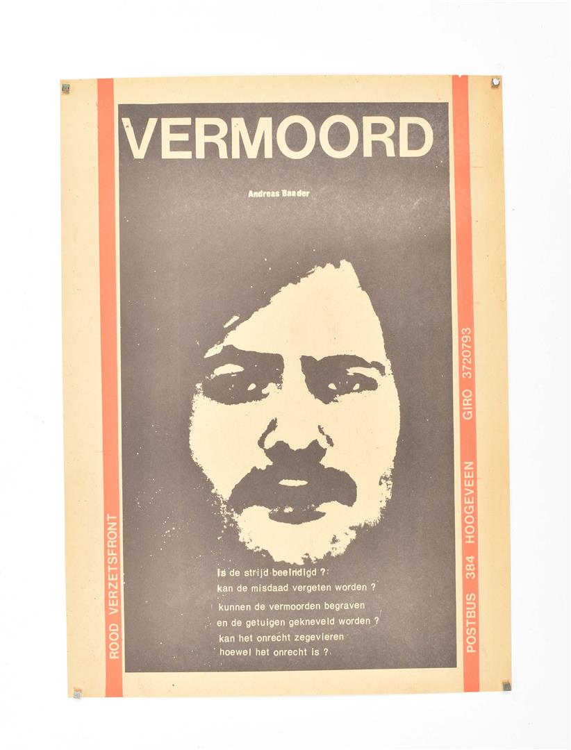 Related to the 1st generation: (1) Vermoord: Andreas Baader. (2) Ingrid Schubert. (3) Gudrun Enslin. (4) Jean Carl Raspe. Posters by Rood Verzetsfront, 43 x 31 cm. (5) RAF Solidariteit! Black variant, 31 x 43.5 cm. -and (6) Vermoord in Duitse Gevangenissen, depicting the inmates (pin holes).
