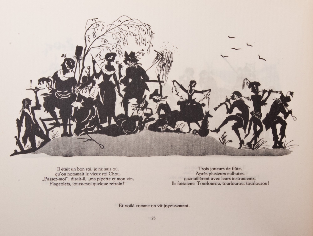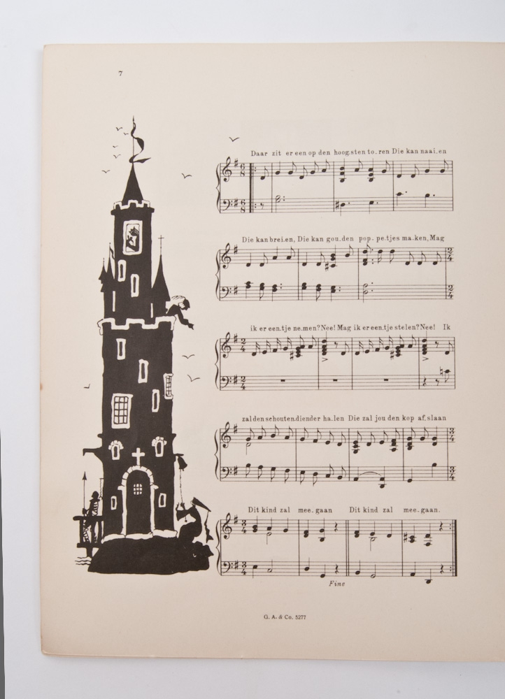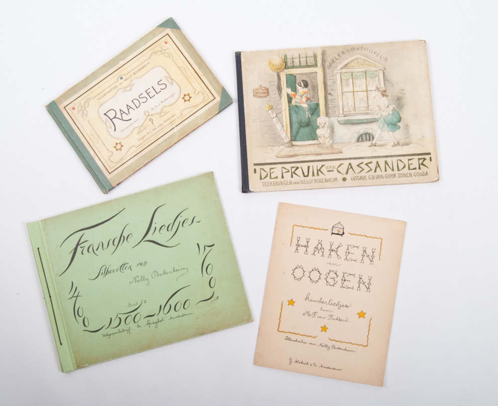 Children's songs by M.F. van Putten, G. Alsbach & Co, Amsterdam. (3), 12 p. Ca. 1920. With Silhouettes by Nelly Bodenheim. 4to, sc. Staples missing, else good copy + Fransche Liedjes. First volume 15th-18th century. De Spieghel, Amsterdam, 1928. No. 290/500 Prof. rebacked. Oblong bound with strings + De Pruik van Cassander, G.B. van Goor Zonen, Gouda, ca. 1925. Oblong sl. damaged edges and corners. Fairly good copy - and 1 other