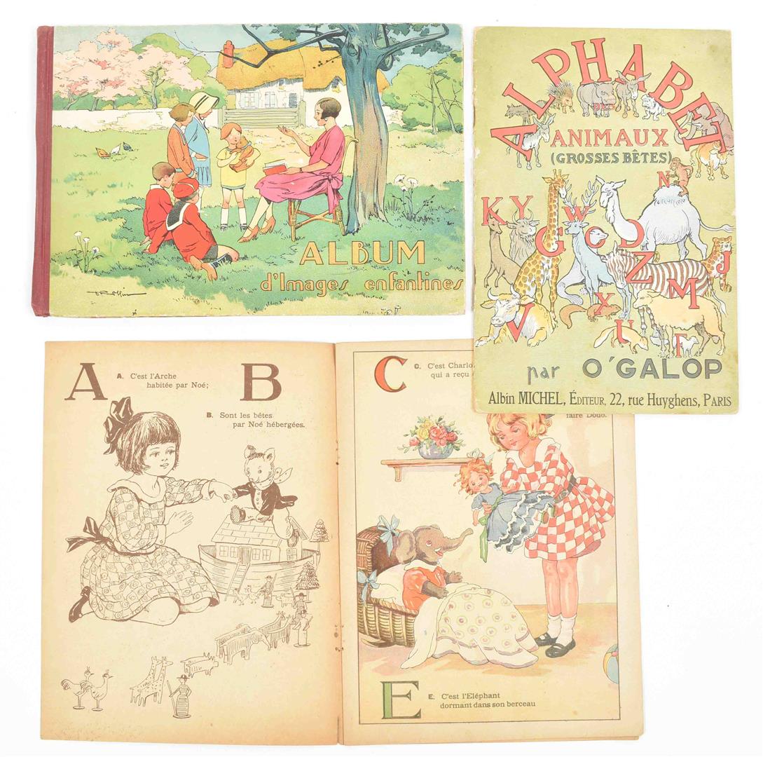 Early 20th cent. Incl. a.o.: (1) O'Galop. Alphabet des animaux (grosses bêtes). Paris, A. Michel, n.d. Ill. sc. (2) ABCD. Brussels, C. Dangotte, 1913. Cloth-backed pictorial boards. -and 4 others. Added: 5 other French children's books, incl. a.o.: (1) Frisemouche fait de l'auto. Editions enfantines Citroën, 1926. Ill. by J. Bruller. Hc. (2) Three bound works of catchpenny prints, incl. Album d'Images enfantines (L. Martinet) and Images Enfantines (Quantin).