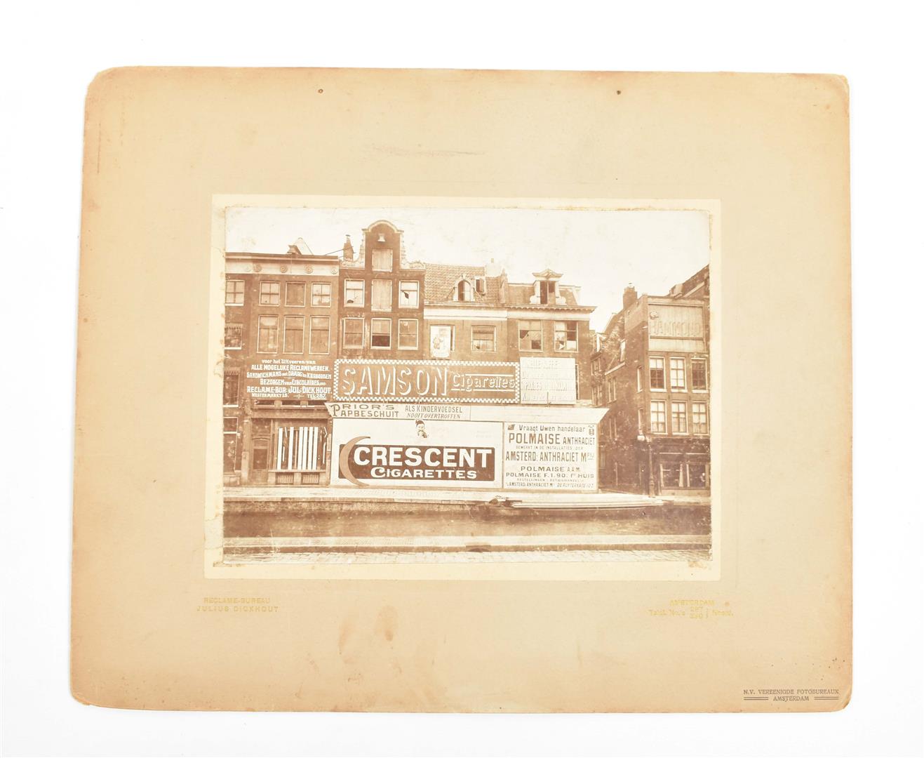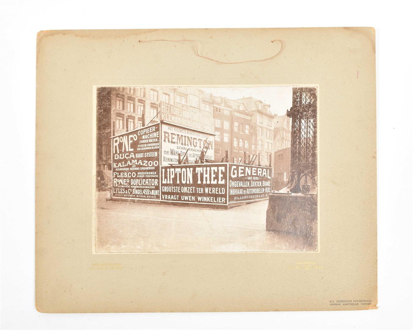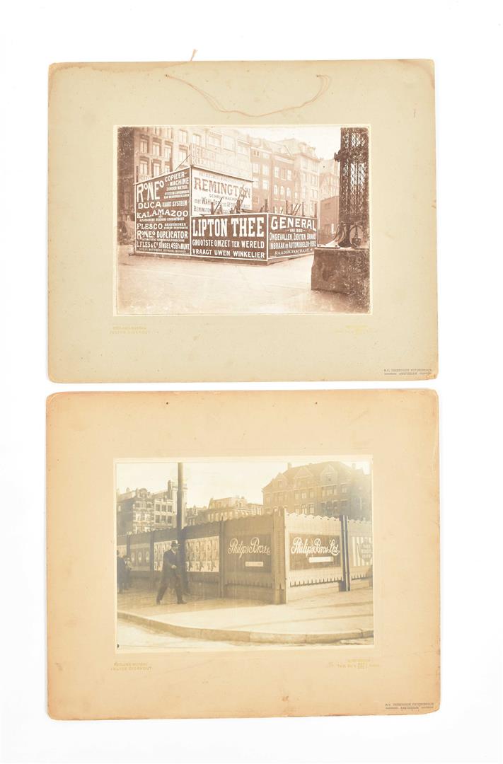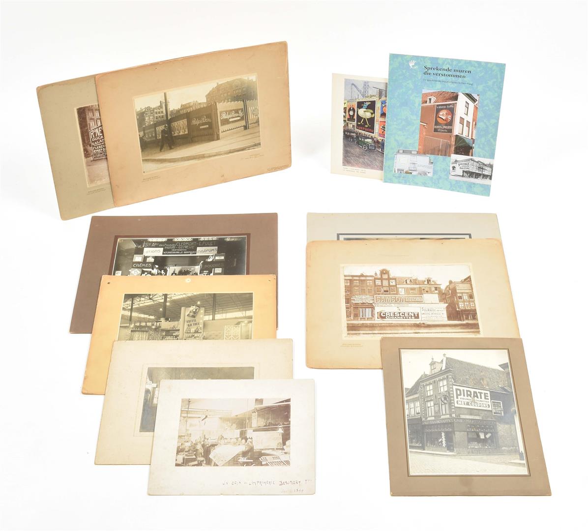 All approx. 17 x 23 cm and on orig. mount w. addresses of Dickhaut and of N.V. Vereenigde Fotobureaux in Amst., ca. 1900. Showing large advertisements on (temporary) fences; one of the photos incorporates an advertisement of the Dickhaut firm itself. W. perforations in top margin for hanging threads (1 preserved). -and 6 others, incl. photos of advertorial exhibition stands of Alex Meijer Koffie en Thee (signed in pencil by photographer G. van der Wiel and w. his stamp verso) and of Automoto (speed)bicycles. Added: Duivesteijn, J. et al. Sprekende muren die verstommen. De geschilderde muurreclames in Den Haag. 1991. 52 p.