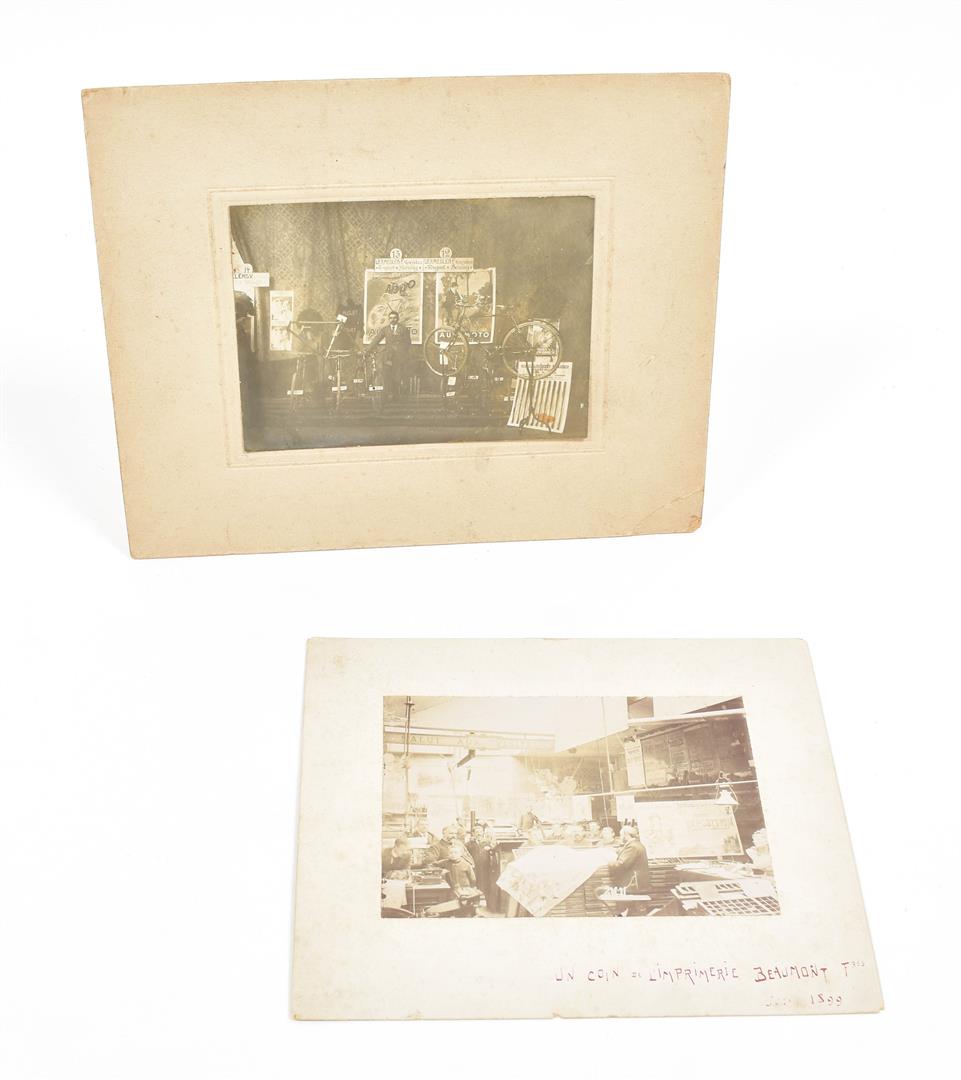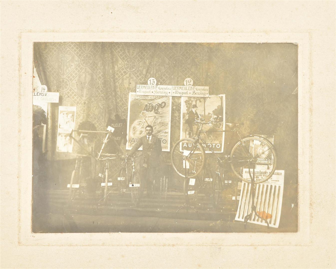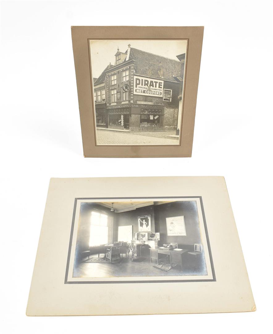 All approx. 17 x 23 cm and on orig. mount w. addresses of Dickhaut and of N.V. Vereenigde Fotobureaux in Amst., ca. 1900. Showing large advertisements on (temporary) fences; one of the photos incorporates an advertisement of the Dickhaut firm itself. W. perforations in top margin for hanging threads (1 preserved). -and 6 others, incl. photos of advertorial exhibition stands of Alex Meijer Koffie en Thee (signed in pencil by photographer G. van der Wiel and w. his stamp verso) and of Automoto (speed)bicycles. Added: Duivesteijn, J. et al. Sprekende muren die verstommen. De geschilderde muurreclames in Den Haag. 1991. 52 p.