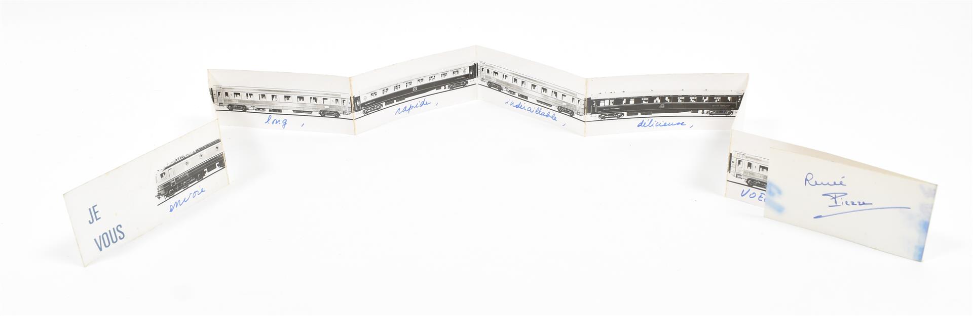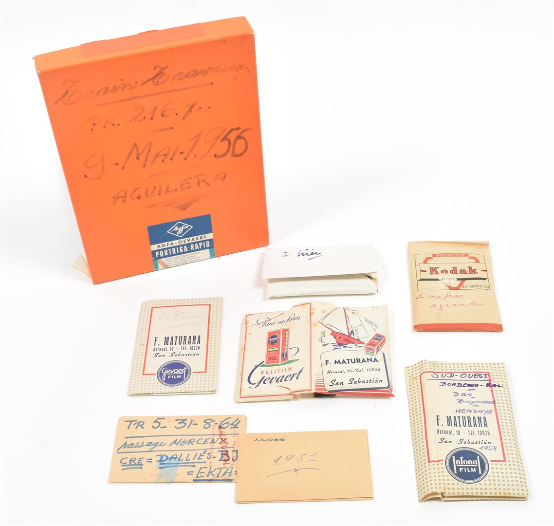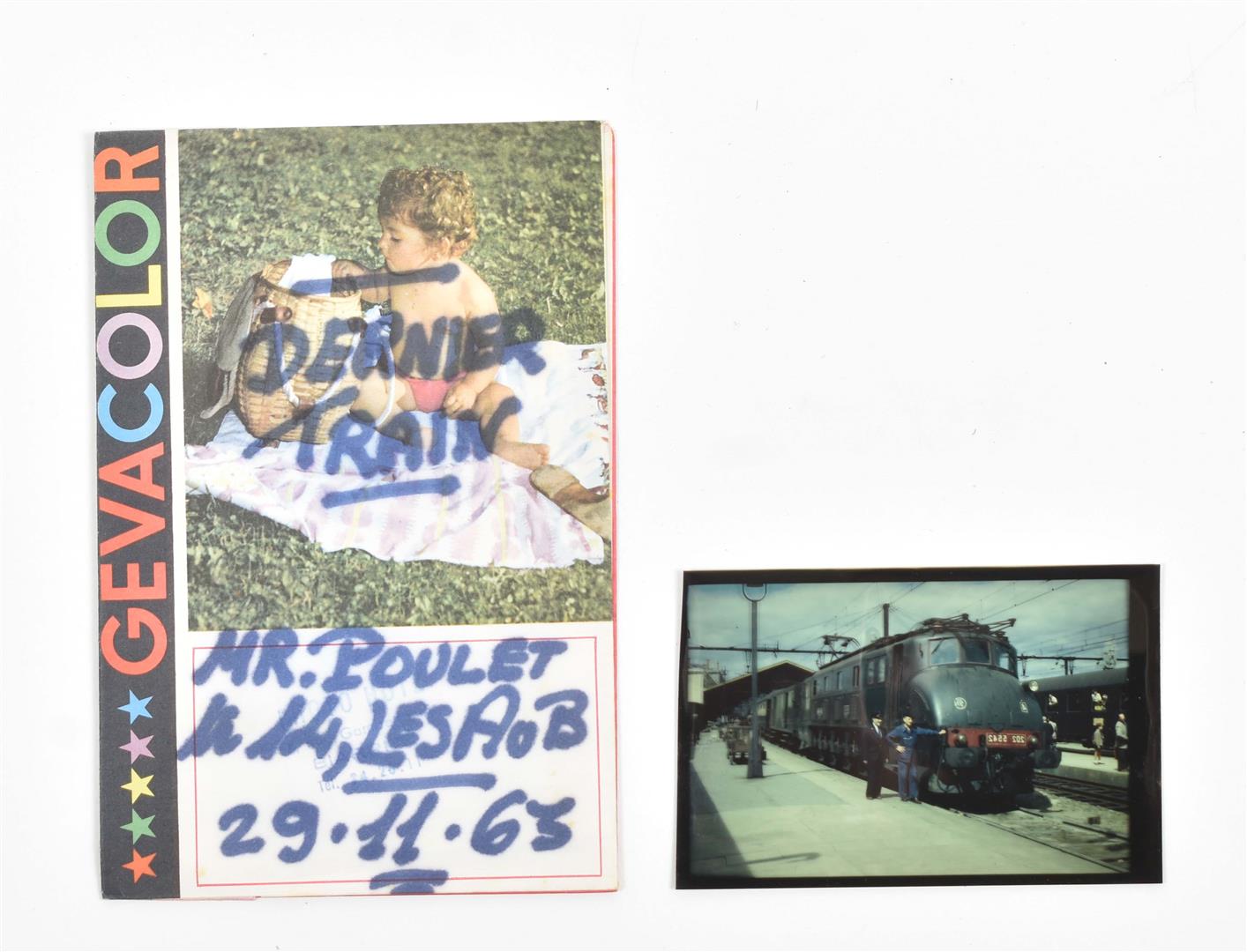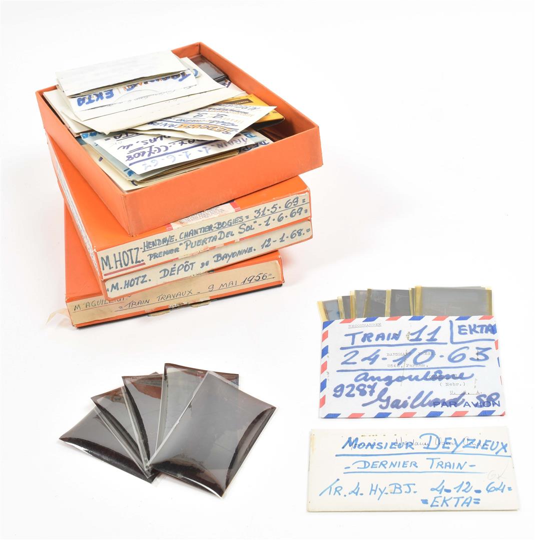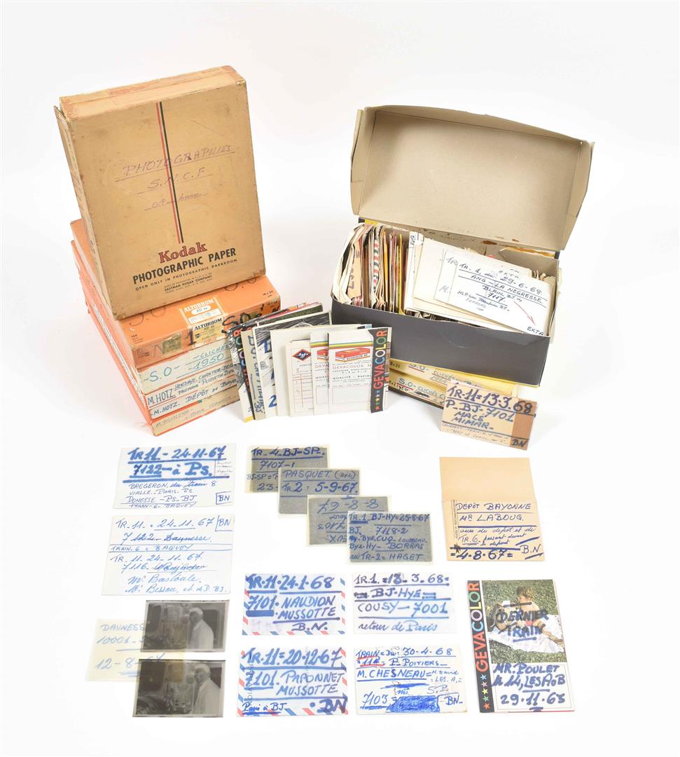 Ca. 1950-1970. Most b/w and 6 x 9 cm and consisting of series kept in numb. envelopes w. the details of the photos. Also w. approx. 350 positives. Some subjects: "M. Aguilera Train Travaux PK. 216.700 9-Mai 1956"; "M. Hotz. Hendaye. Chantier-Bogies. 31-5.69 (...)"; "Negatives SNCF O.P."; "Photos SNCF Diverses O.P. 1949 à 1963" (incl. a series of approx. 70 positives); "S.O. clichés B.N. 1964 à 1969"; and "S.O. clichés couleur 1950 à 1969".