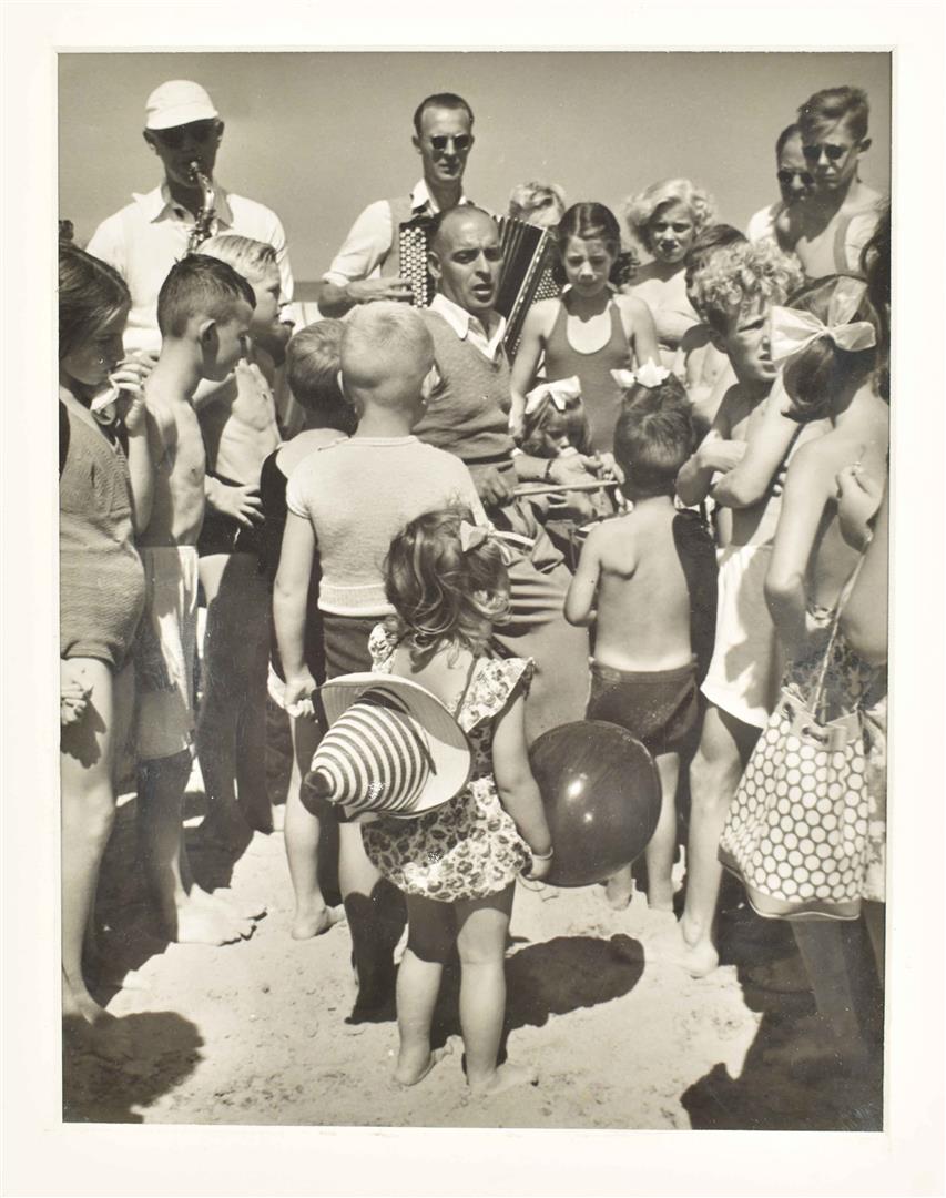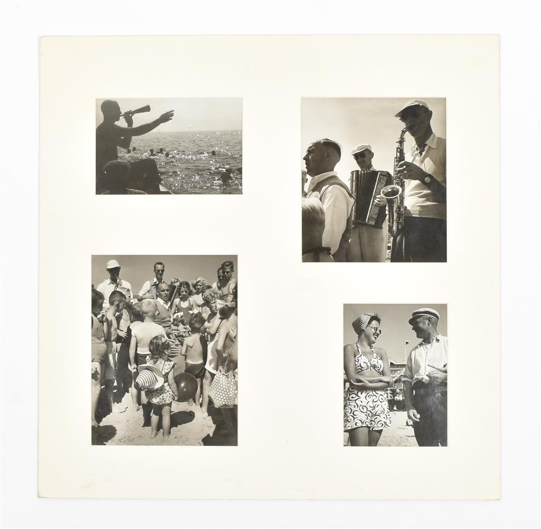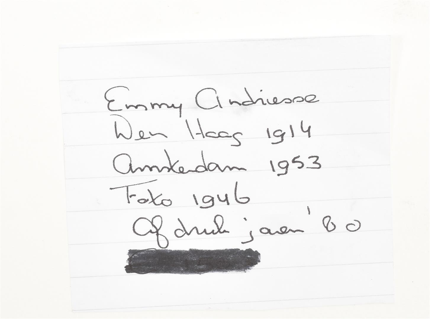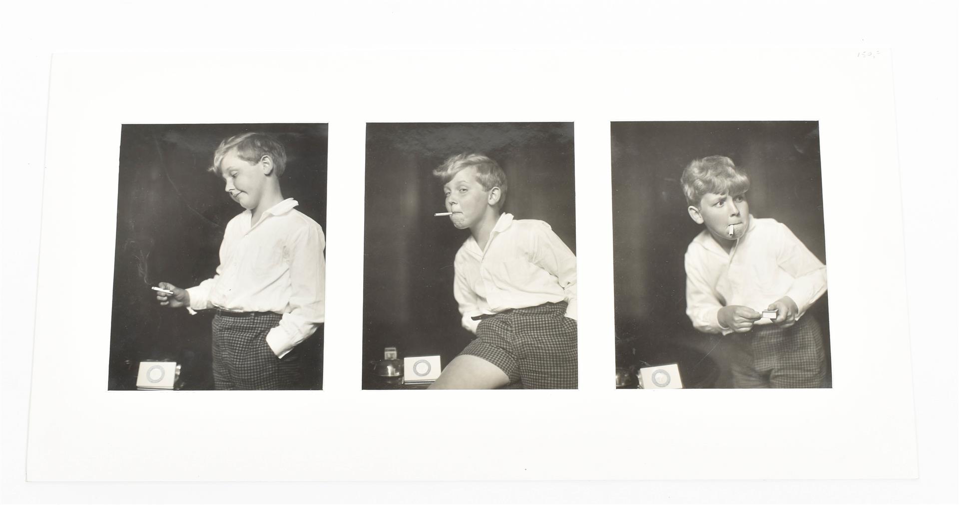 Silver gelatine print, 40.5 x 50.5 cm, titled in felt tip pen below the image, verso w. monogrammed annotations "printed early '80's" and "Voor Han van der Waerden 27 mei 1992" in pen. Minimal imperfections. (2) Andriesse, E. (1914-1953). Fashion model. Silver gelatine print, sheet size 40 x 51 cm, under passepartout w. label "foto 1946 afdruk jaren '80" verso. Lower margin wrinkled/ w. folds, without blank upper and lower margin. -and 7 others under 2 large passepartouts: 4 photogr. by Stevens & Machielsen, ca. 1950, and 3 press photogr. of a smoking boy by Hehmke-Winterer.