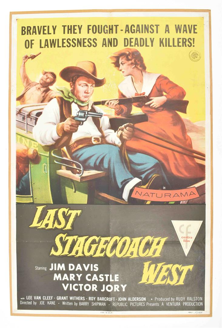 (1) War of the Wildcats, starring John Wayne. 1943. 97 x 67 cm. Re-backed, a worn copy w. folds and sm. marginal pieces lacking. (2) Last Stagecoach West. 1957. Lithogr., 100 x 65 cm. Stamp Centrafilm Dordrecht recto and verso. Re-backed, folds (sm. hole along one fold), marginal pinholes.