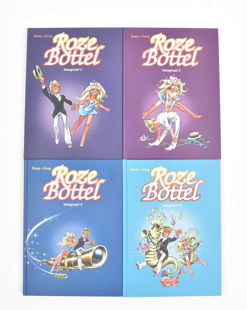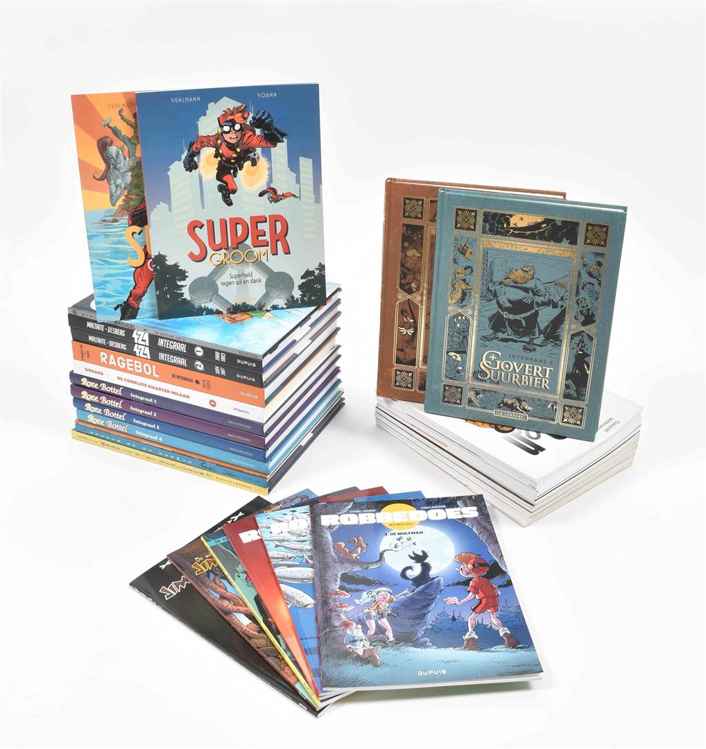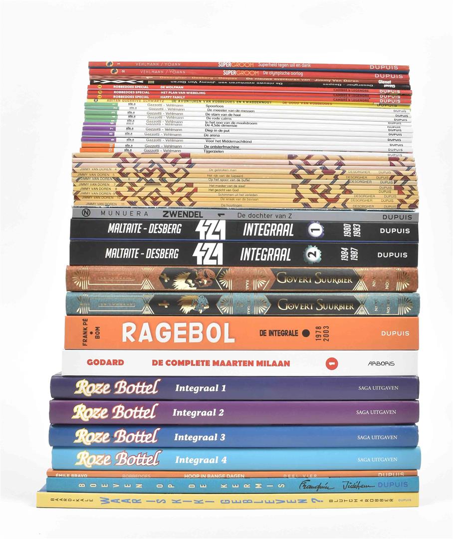 (1) Roze Bottel Integraal. Saga, 2017-2018. Vols. 1-4. Hc. (2) 421 Integraal. Dupuis, 2022. Vols. 1-2. Hc. (3) Jimmy van Doren. Dupuis, 1989-1999. Nos. 1-11. Sc. -and 2 other of the same. (4) Alleen. Idem, 2000s. Nos. 1-10 & 13. Sc. -and 15 var. others, incl. Govert Suurbier Integraal (vols. 1-2) and Ragebol Integraal 1978-2003.