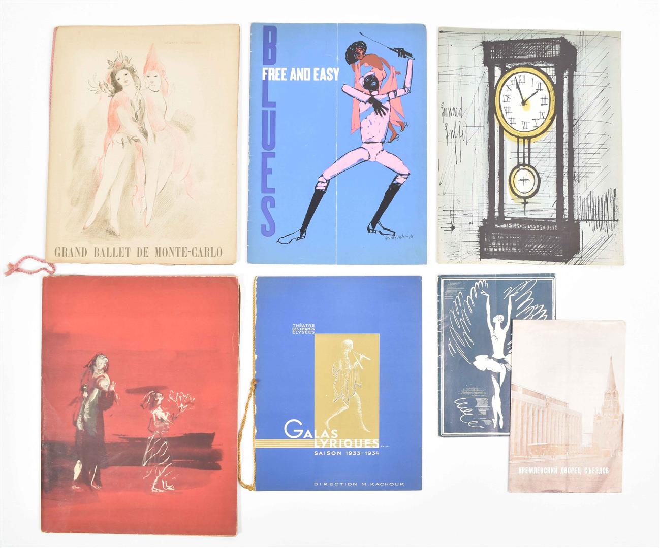 Early to mid 20th cent., most relating to ballet. (1) Four programmes from the Ballets des Champs-Elysées. (2) Five programmes for Ballets Russes (Soviétiques), 2 of which in Russian. -and others from the Ballets de Paris, the Royal Ballet, Grand Ballet de Monte-Carlo and the Théatre des Champs Elysées.