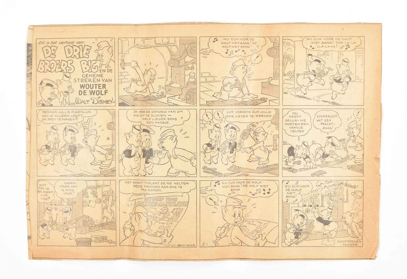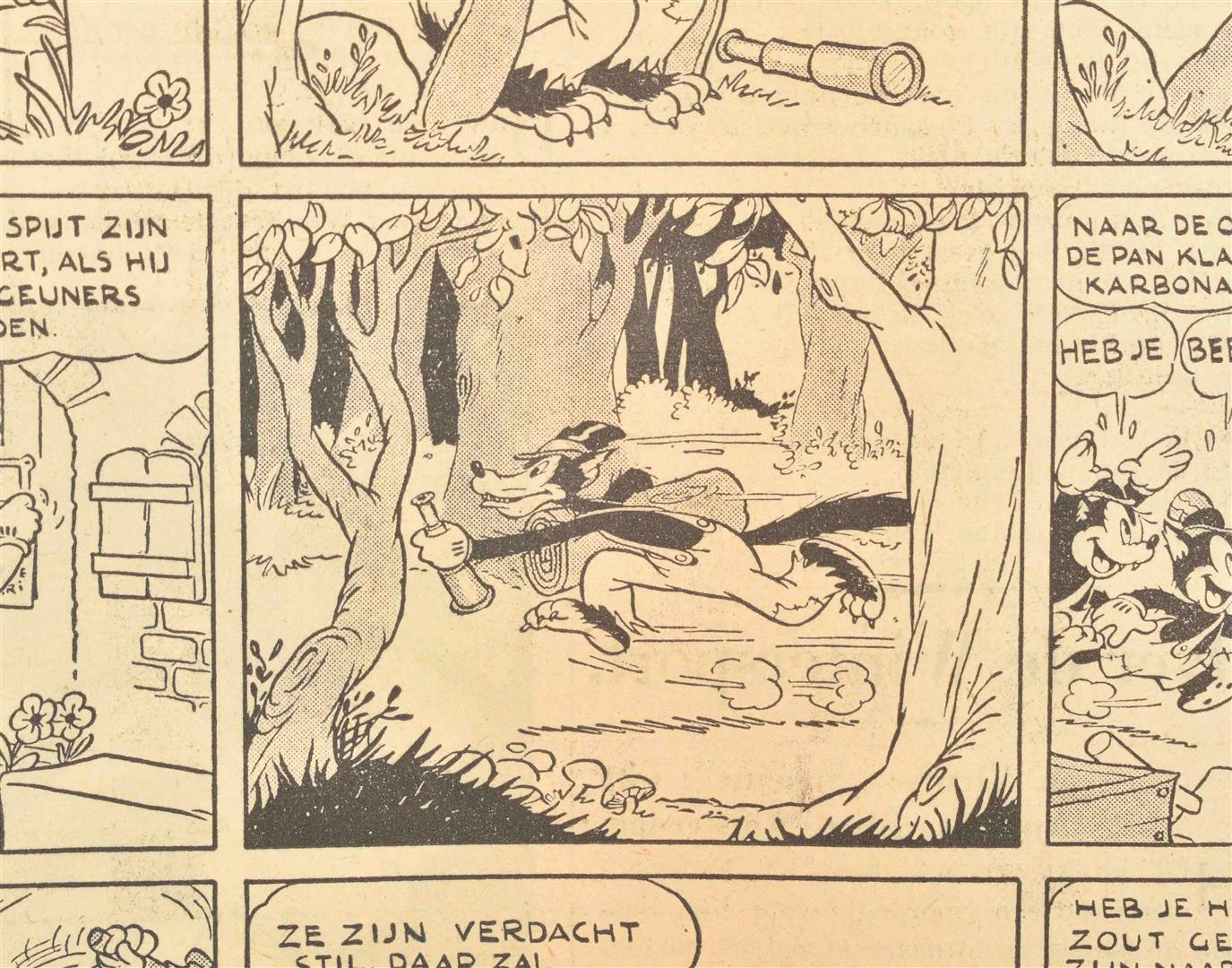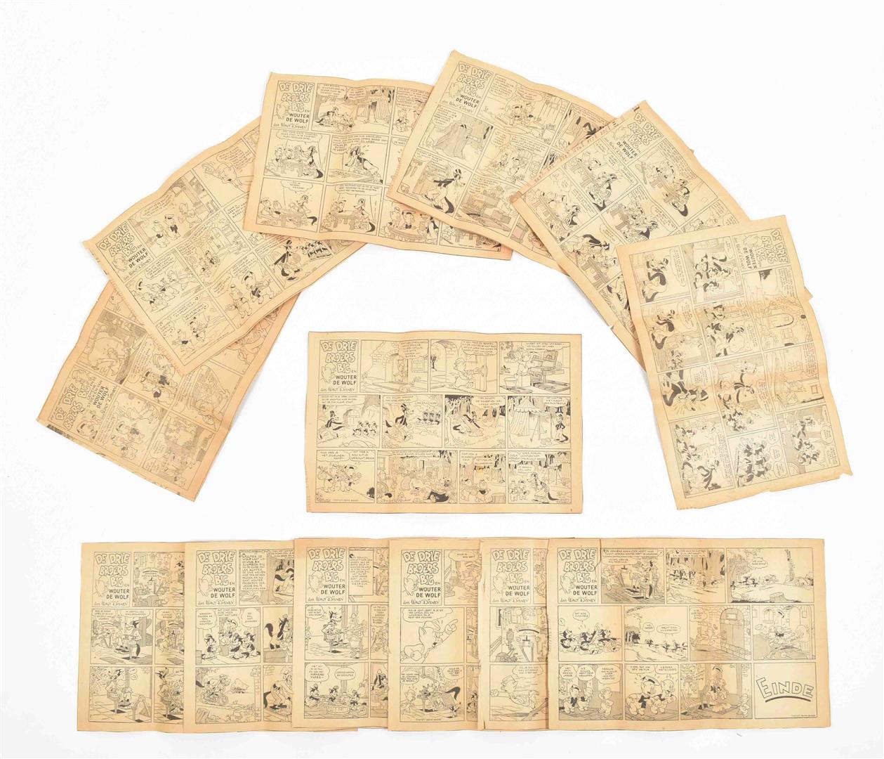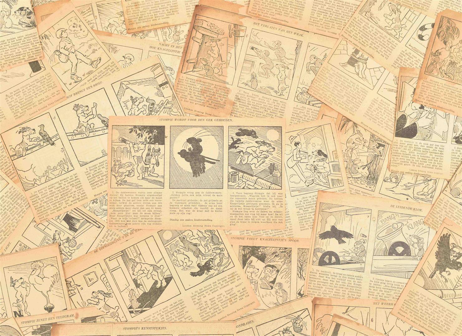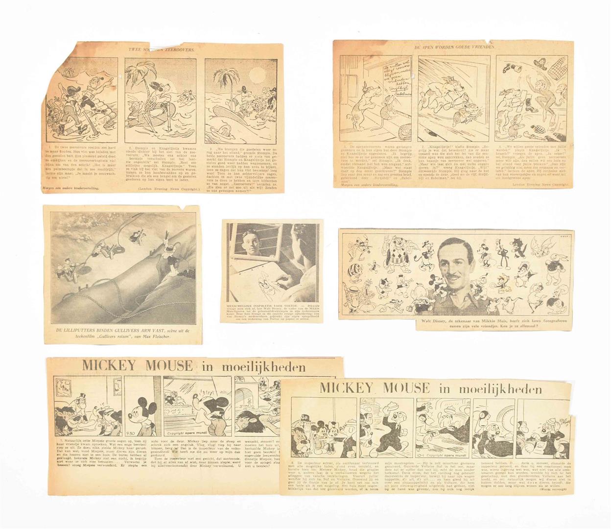 Newspaper clippings of the comic, 1930s. Incl. a.o.: (1) Het verhaal van: de drie broers Big en de gemene streken van Wouter de Wolf 1-15. Each half-p., publ. in de Telegraaf, ca. 1934. (2) Mikkie Muis. 15 stories, publ. between 1935 and 1940. Two stories complete (Mikkie Muis en de struisvogel Oscar = 1270-1335 and Mikkie Muis in het spookhuis van generaal Buskruit = 1452-1551), 13 stories almost or for the most part complete. (3) 54 var. Mikkie Muis newspaper clippings. (4) 'Stompie and Knagelijntje'. 58 newspaper clippings. All publ. in de Telegraaf, 1930s.