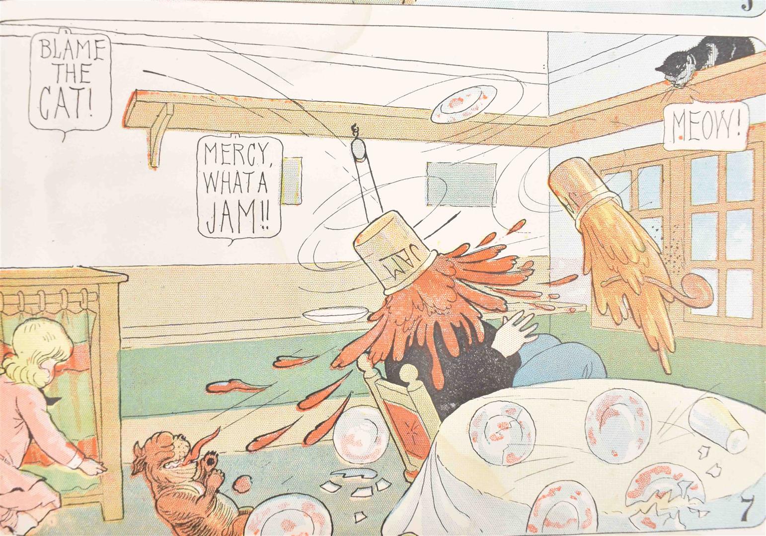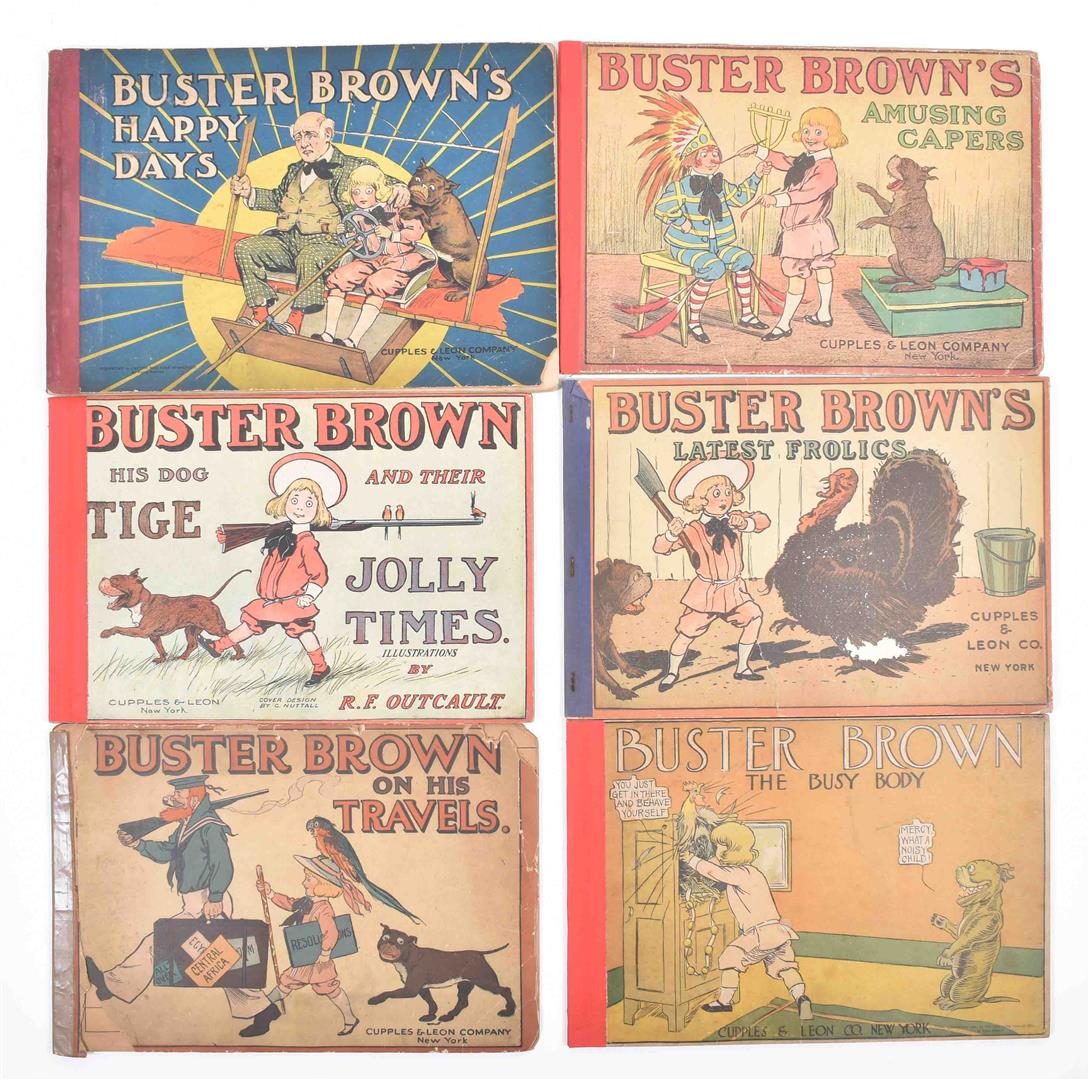 6 books from this famous American comic, all publ. by Cupples & Leon in New York. (1) Buster Brown, His Dog Tige and Their Jolly Times. 1906. (2) Buster Brown's Latest Frolics. 1907. (3) Buster Brown's Amusing Capers. 1908. (4) Buster Brown the Busy Body. 1909. (5) Buster Brown on His Travels. 1910. Front cover detached, torn, spine reinforced. (6) Buster Brown's Happy Days. 1911.