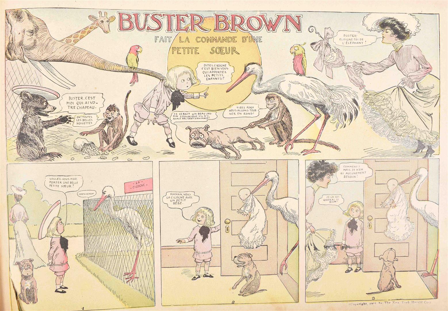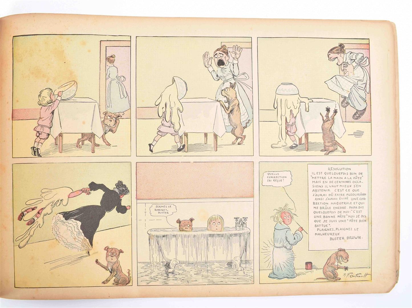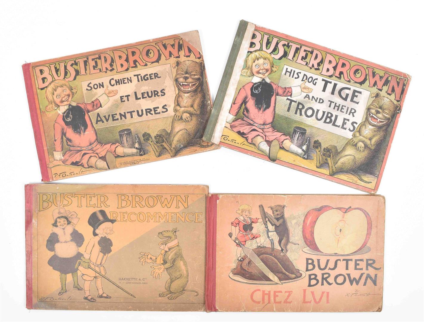 3 French eds., all publ. by Hachette in Paris. (1) Buster Brown, son chien Tiger et leurs aventures. 1904. -and an English ed. of the same (Stokes, 1904). (2) Buster Brown Recommence. 1908. (3) Buster Brown Chez Lui. (1914). Lacking title-p.
