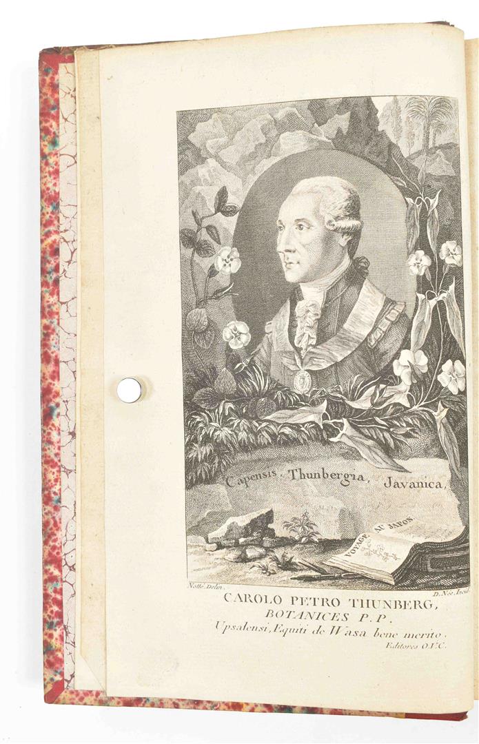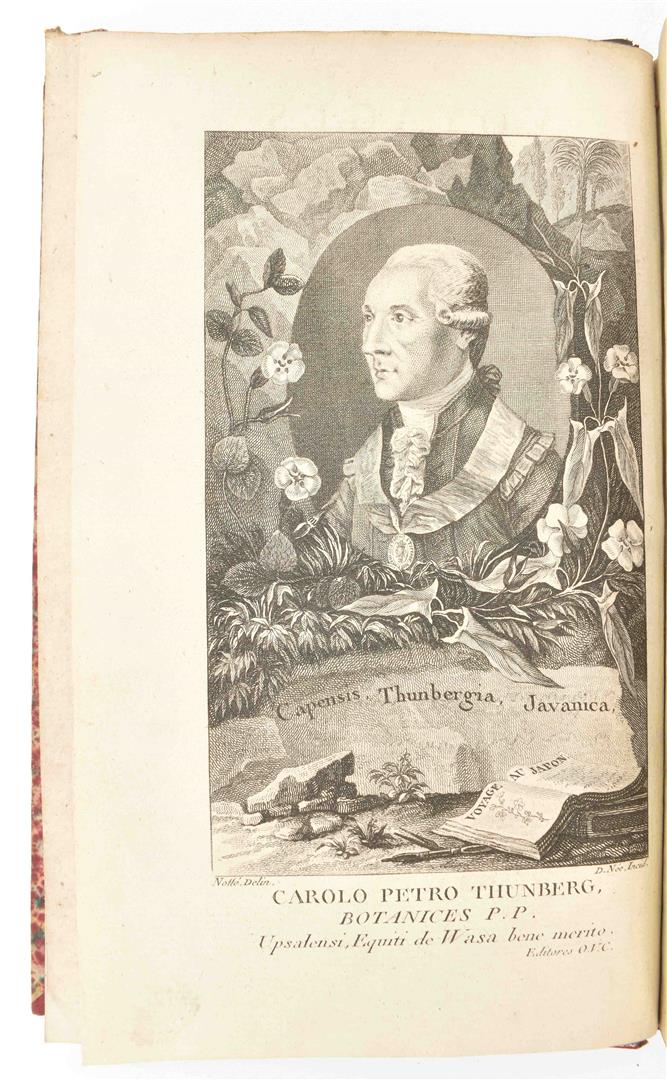 Some plates bound out of order, occas. foxed and sm. other internal imperfections, dam. to spine of the 1st vol. A good set. Cordier, Bibl. Japonica p.447; Chadenat 1763. Thunberg (1743-1828) was Swedish surgeon and botanist and a follower Linnaeus. He entered the Dutch East India Company (V.O.C.) as a surgeon on board the Schoonzicht. Thunberg sailed in 1775 for Batavia in Java and finally ended up at the Dutch trading post at Nagasaki, where he stayed on Deshima island. His freedom to move around and study was very limited and only in 1776 was he permitted to travel though Japan to Yedo together w. a Dutch delegation under Arend Willem Feith. (total 4)