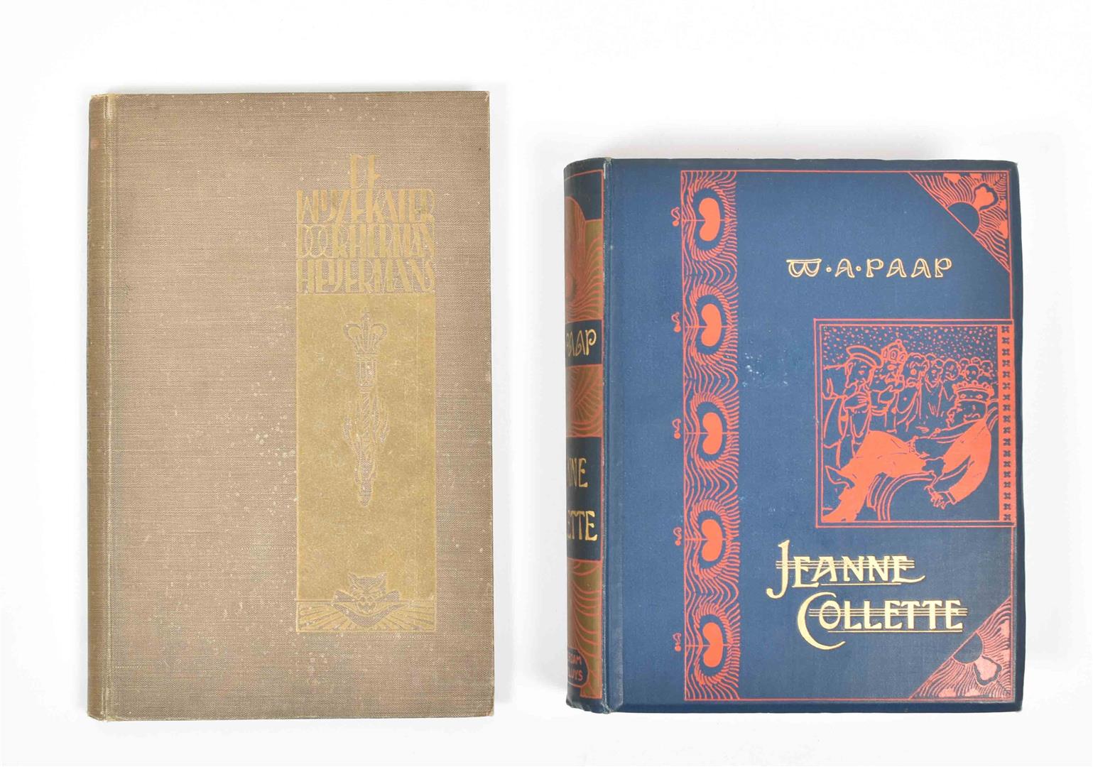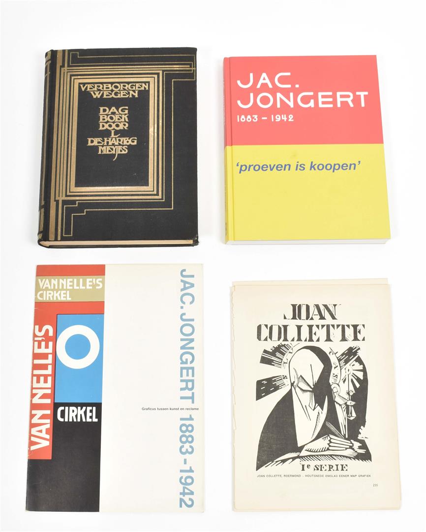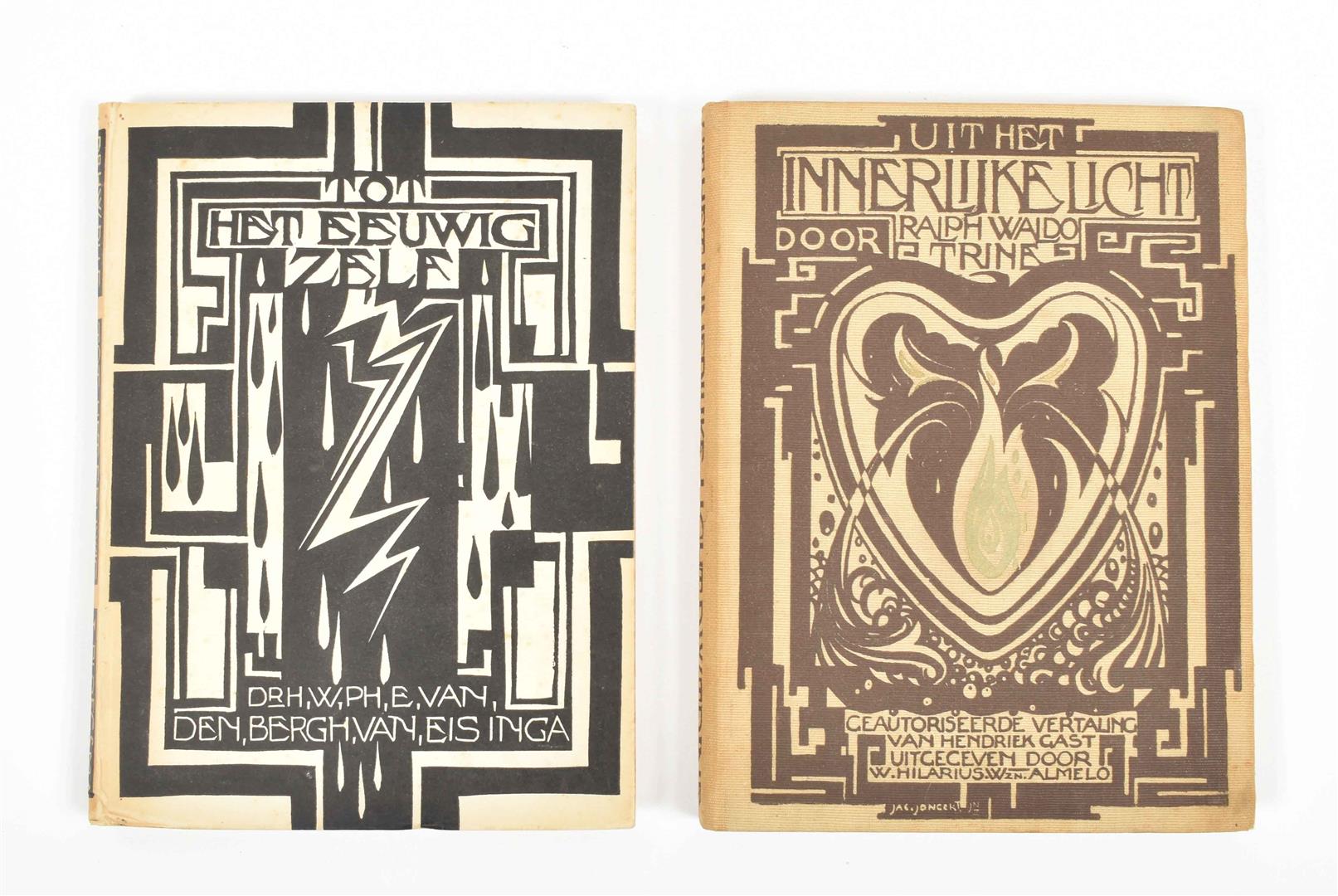 4 books w. covers des. by Jongert, incl. Tot het Eeuwig Zelf; Een boek van godsdienstige opvoeding by H.W.P.E. van den Bergh van Eysinga and Uit het innerlijke licht by R.W. Trine (both publ. by Hilarius, Almelo, ca. 1918). All cl. Sl. worn. (2) Heijermans, H. De wijze kater. Een boosaardig sprookje in 3 bedrijven. Arnhem, Van Lochum, Slaterus en Visser, 1919. Cover, layout and ill. des. by H.T. Wijdeveld. Cl. Sl. worn. (3) Paap, W.A. Jeanne Collette. Amst., W. Versluys, 1896. 2 parts in 1 vol., w. orig. art nouveau cover by anonymous artist, 574 p., cl. -and 4 others w. covers in art nouveau/ art deco styles, incl. by Georg Rueter. Added: 2 reference works on J. Jongert.