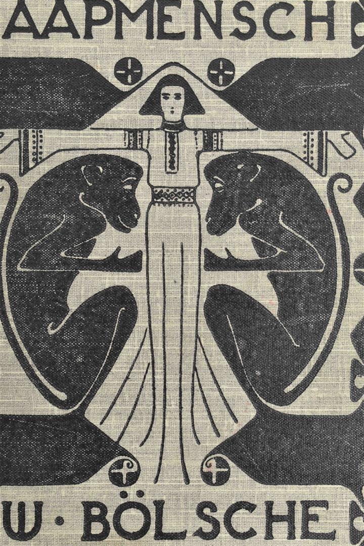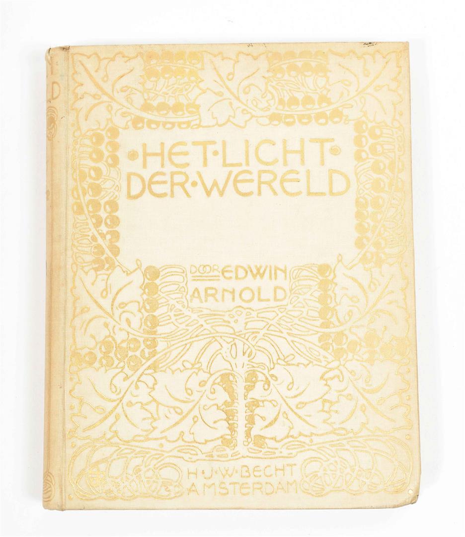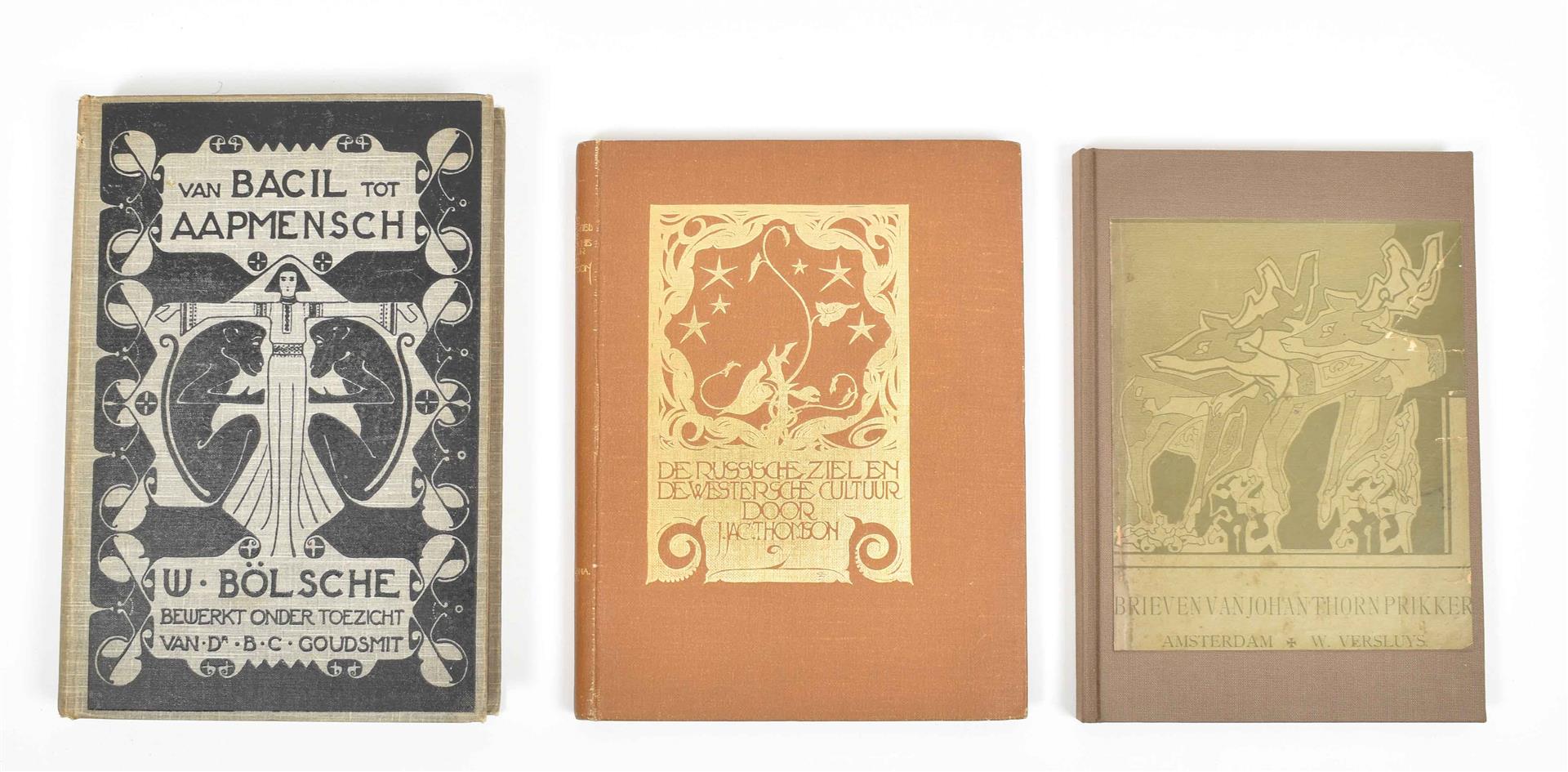 4 books w. covers des. by Jongert, incl. Tot het Eeuwig Zelf; Een boek van godsdienstige opvoeding by H.W.P.E. van den Bergh van Eysinga and Uit het innerlijke licht by R.W. Trine (both publ. by Hilarius, Almelo, ca. 1918). All cl. Sl. worn. (2) Heijermans, H. De wijze kater. Een boosaardig sprookje in 3 bedrijven. Arnhem, Van Lochum, Slaterus en Visser, 1919. Cover, layout and ill. des. by H.T. Wijdeveld. Cl. Sl. worn. (3) Paap, W.A. Jeanne Collette. Amst., W. Versluys, 1896. 2 parts in 1 vol., w. orig. art nouveau cover by anonymous artist, 574 p., cl. -and 4 others w. covers in art nouveau/ art deco styles, incl. by Georg Rueter. Added: 2 reference works on J. Jongert.