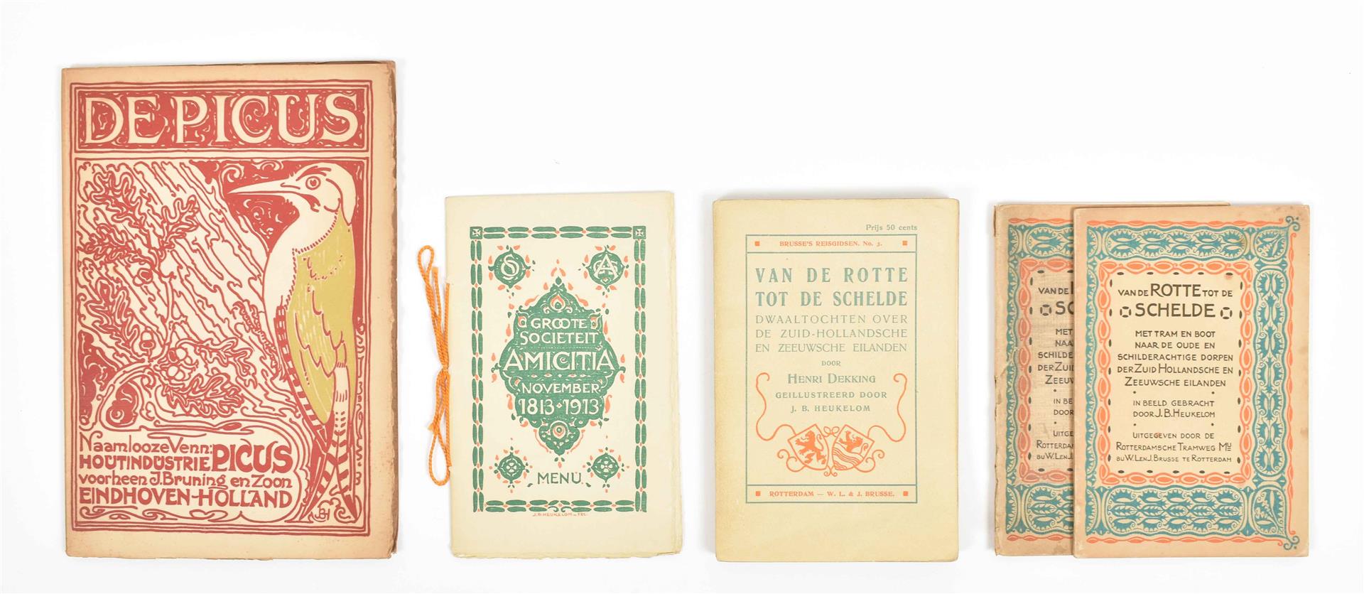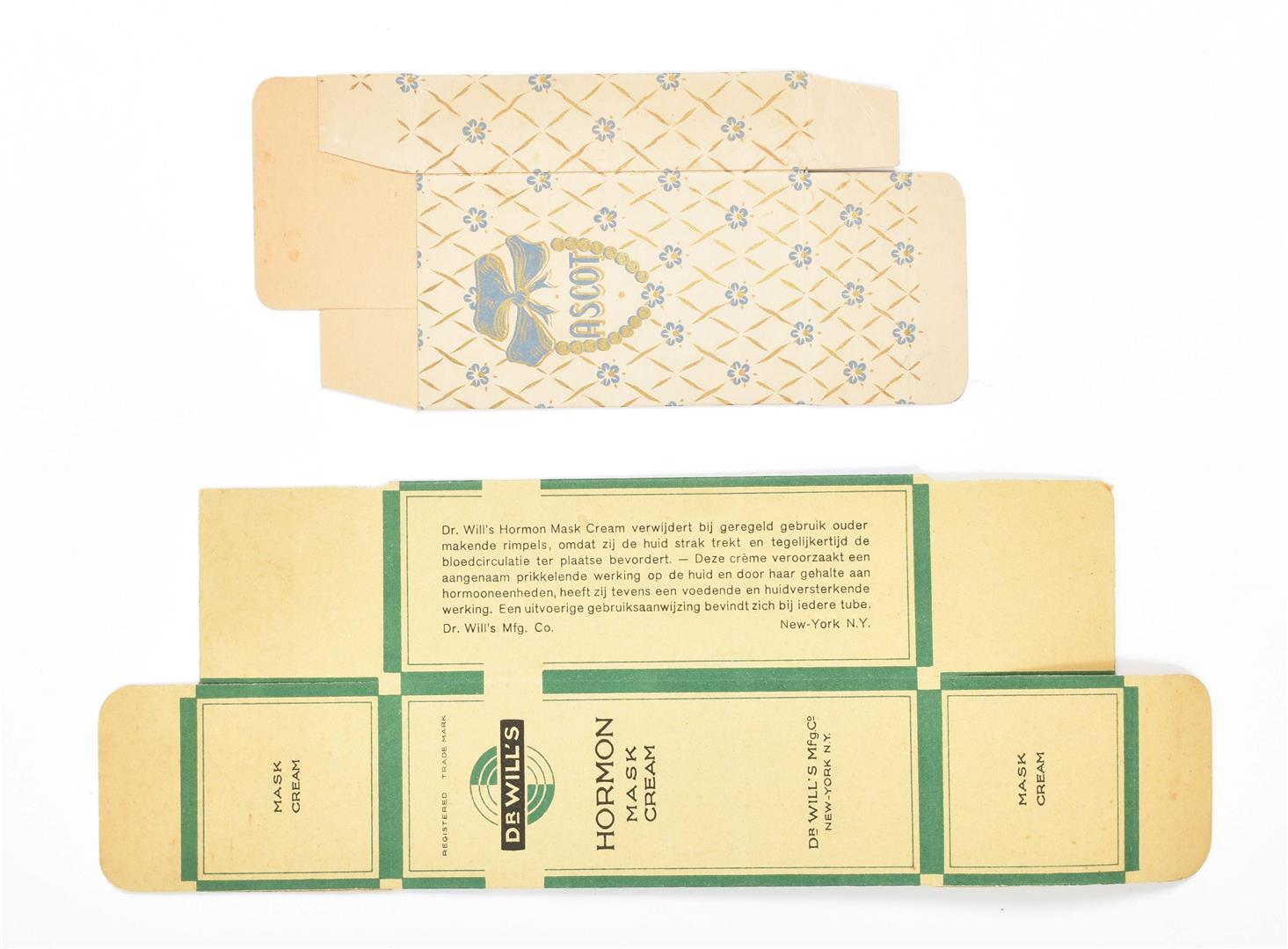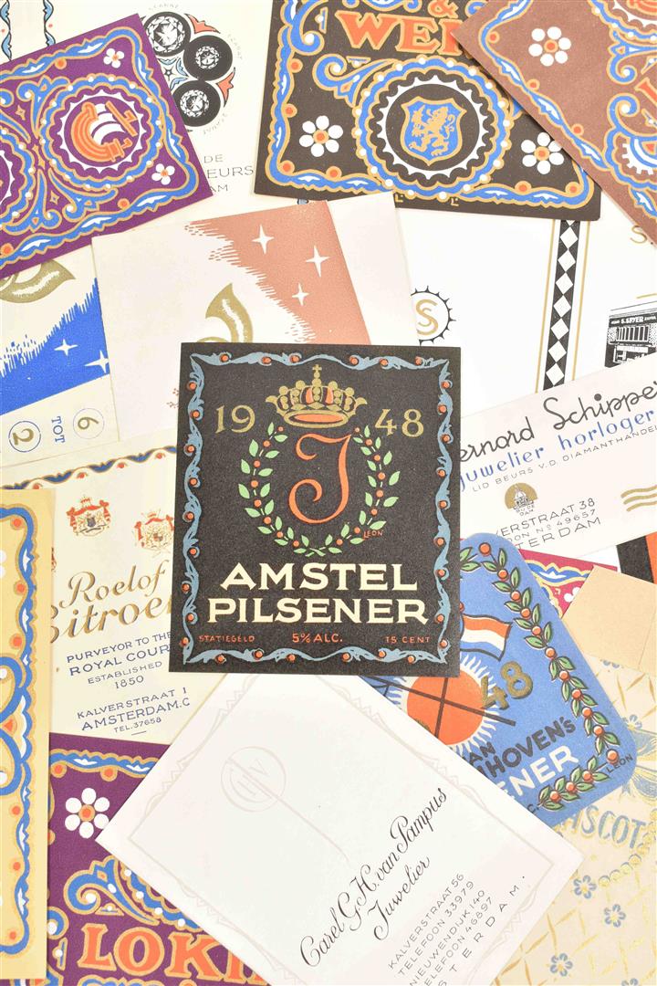 Ca. 1920-1960. (1) Echtes Waaning-Tilly Oel. Das altbewahrte Heilmittel. Einzige Fabrikanten Gebr. Waaming-Tilly Haarlem Holland. Haarlem, ca. 1930. Book dec. and orig. stapled wr. des. by Léon. (2) Unused cardboard box for a bottle of Echtes Waaning-Tilly Oel, 2.5 x 2.5 x 10.5 cm -and 3 other unused cardboard boxes and des. by Léon. (3) Slank en gezond door Zonnegoud Vermagerings-Kruiden. Zonnegoud - Haarlem. Packing label, 23 x 16.7 cm. (4) Horco Shawls. Horco Product. 2 cardboard displays, 18.5 x 13 cm. -and approx. 30 others w. des. by Léon. Added: 5 books w. cover des., ills. and layout by Jan Bertus Heukelom.