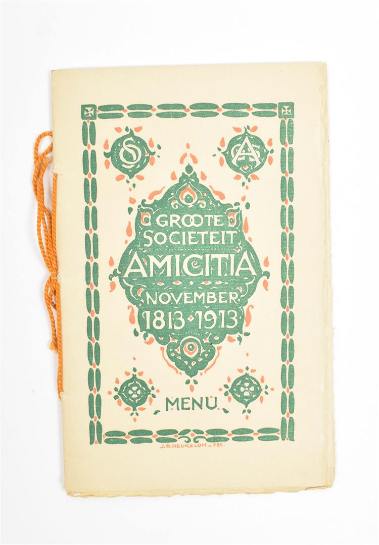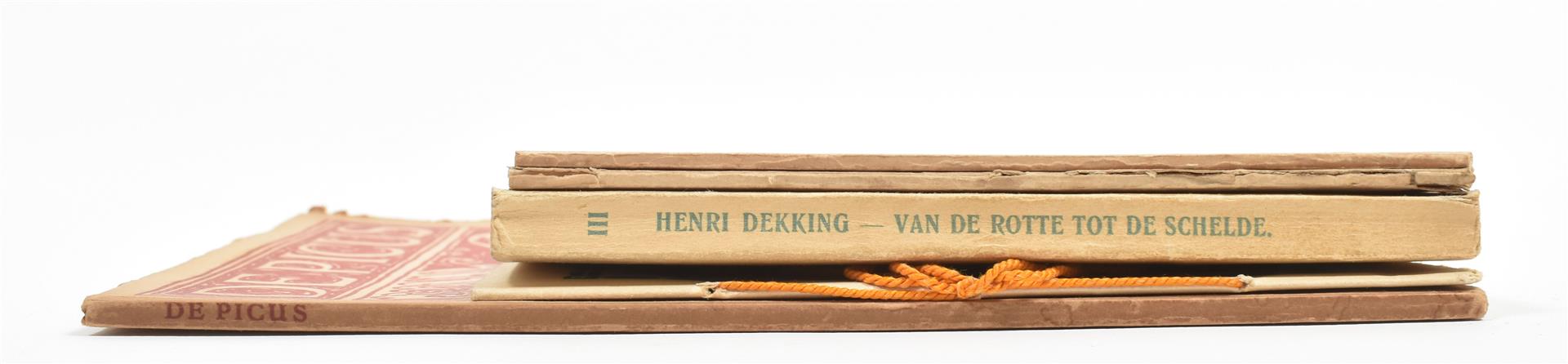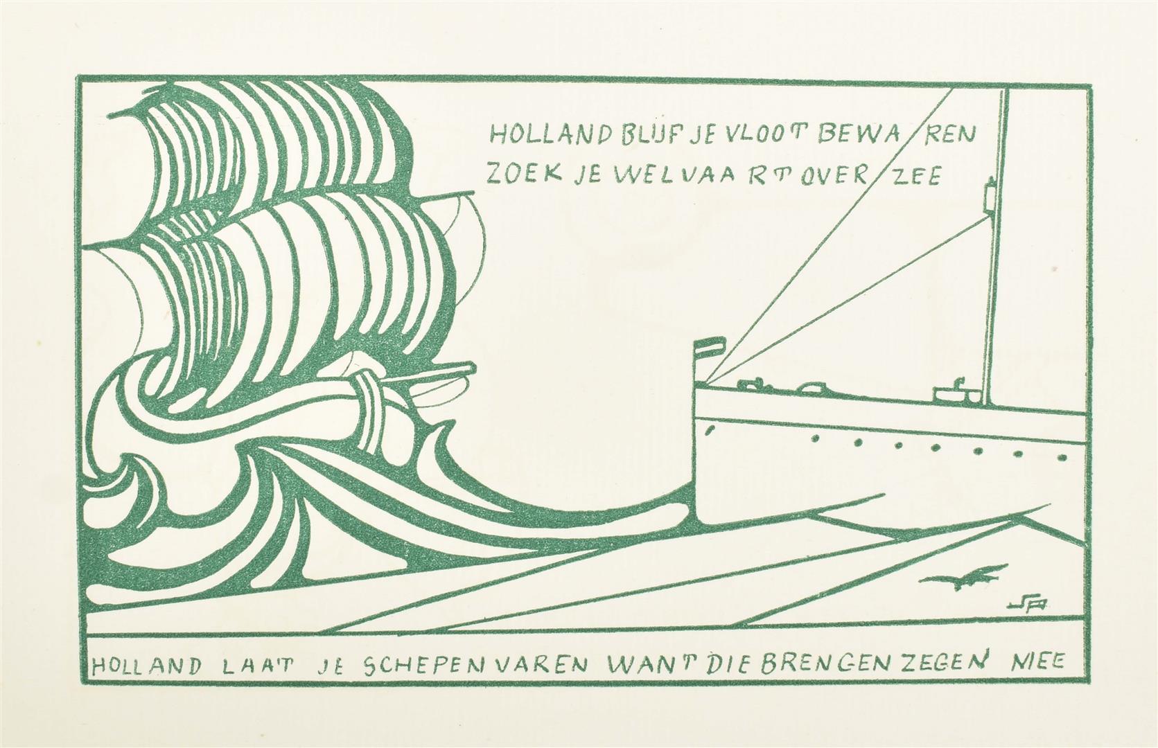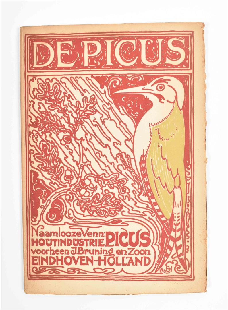 Ca. 1920-1960. (1) Echtes Waaning-Tilly Oel. Das altbewahrte Heilmittel. Einzige Fabrikanten Gebr. Waaming-Tilly Haarlem Holland. Haarlem, ca. 1930. Book dec. and orig. stapled wr. des. by Léon. (2) Unused cardboard box for a bottle of Echtes Waaning-Tilly Oel, 2.5 x 2.5 x 10.5 cm -and 3 other unused cardboard boxes and des. by Léon. (3) Slank en gezond door Zonnegoud Vermagerings-Kruiden. Zonnegoud - Haarlem. Packing label, 23 x 16.7 cm. (4) Horco Shawls. Horco Product. 2 cardboard displays, 18.5 x 13 cm. -and approx. 30 others w. des. by Léon. Added: 5 books w. cover des., ills. and layout by Jan Bertus Heukelom.