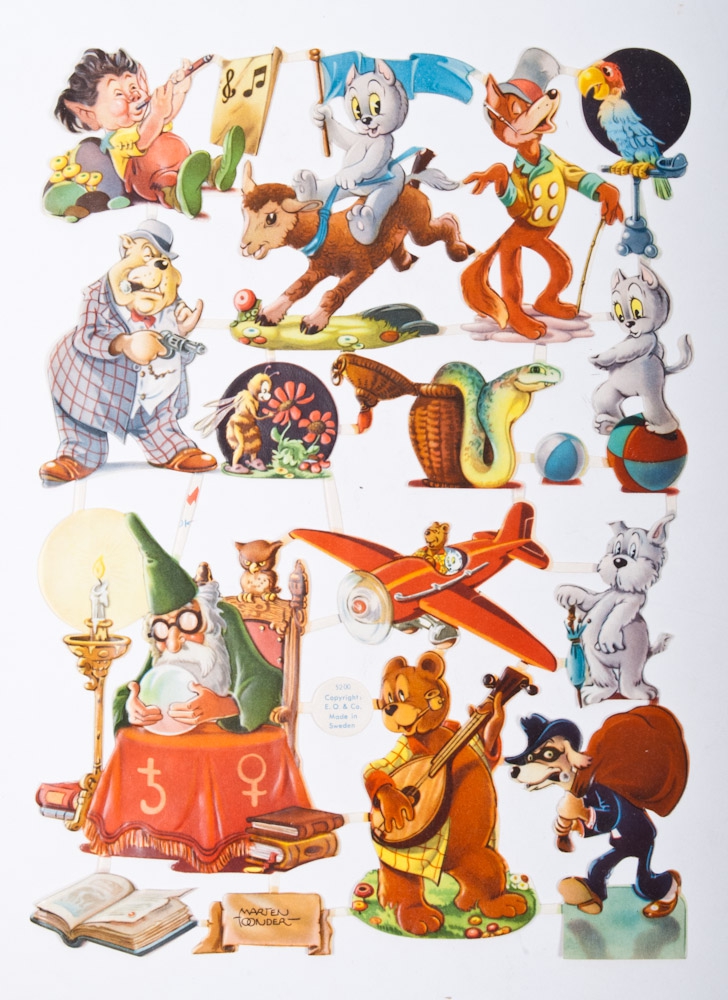E. Olssen & Co, Mixed Comic Characters, Zweden, 1950. Complete sheet poezieplaatjes in good condition, no. 5200, unused. + idem, other scenes, in various pictures.