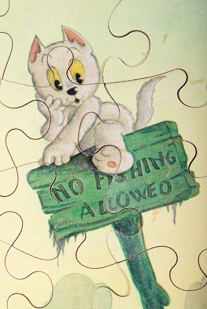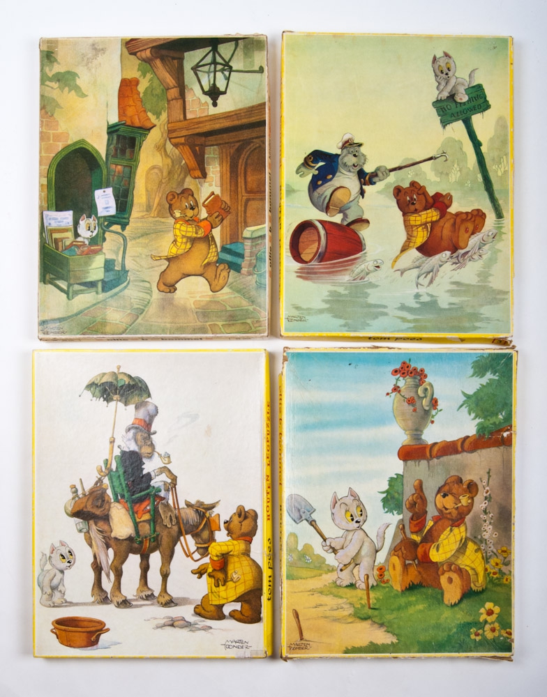 Series jigsaw puzzles in box, ca. 1950. (Santbrink 6, p. 47) "Aap te paard", "Verboden te Vissen" and "Het Bloementuintje" and "Het Boekenstalletje". Under glass. + The original boxes with pasted plate.