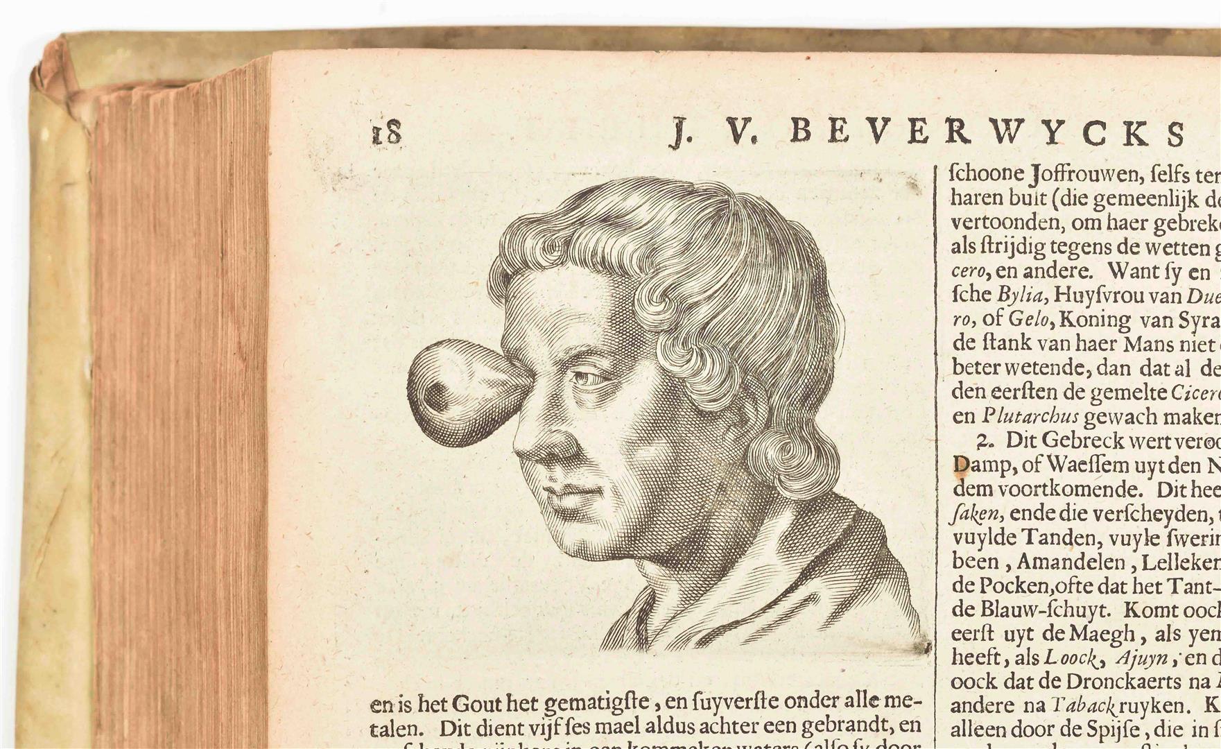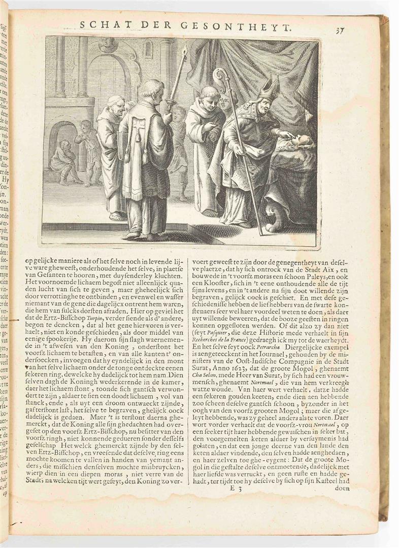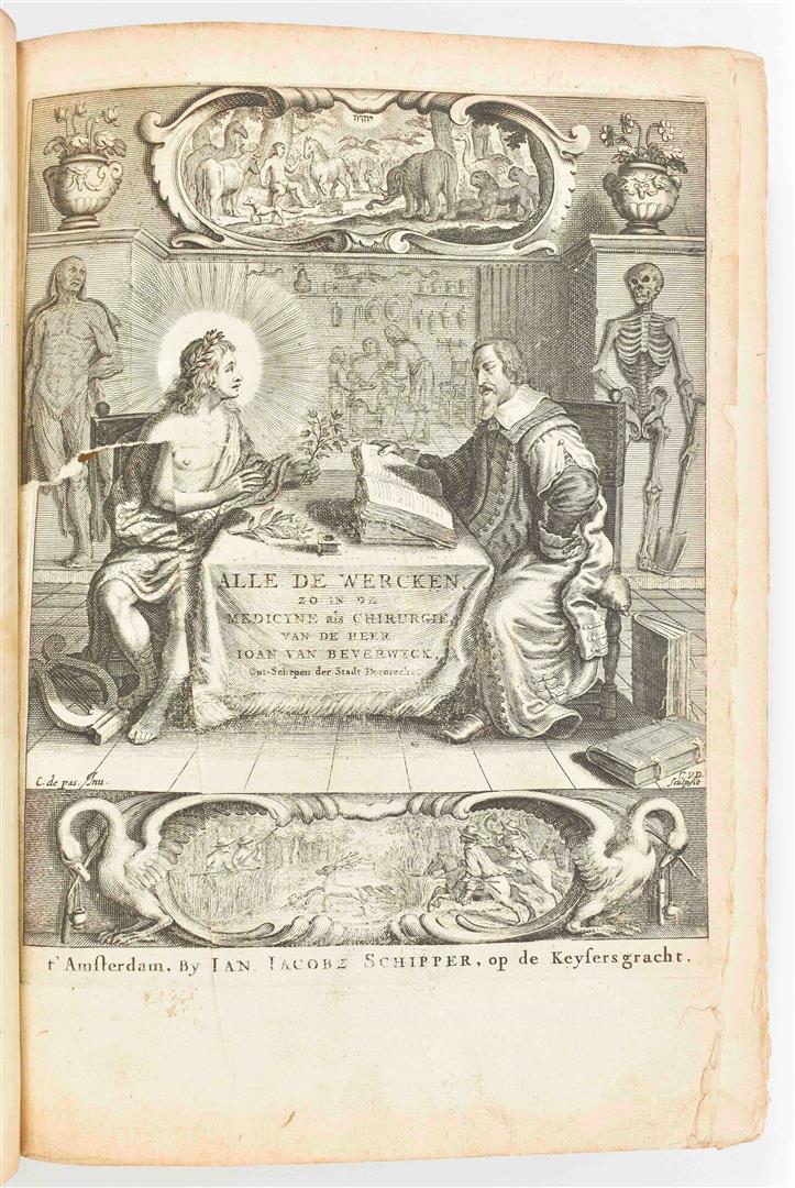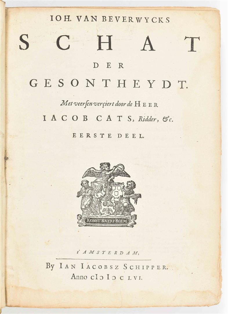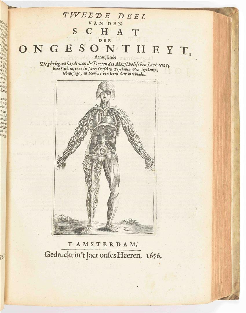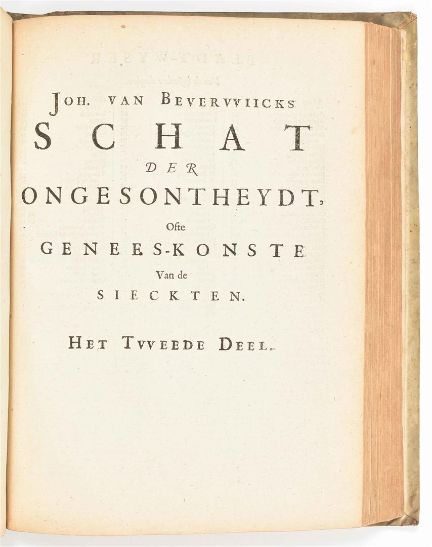 Schat der Ongesondtheydt ofte Genees-Konste van de Sieckten. Amst., J.J. Schipper, 1656. Num. parts in 1 vol. Engr. title (sm. tear) by C. Van Daele, num. ills. (3x full-p.). Cont. vellum (stained), manuscript title on spine. 4to.