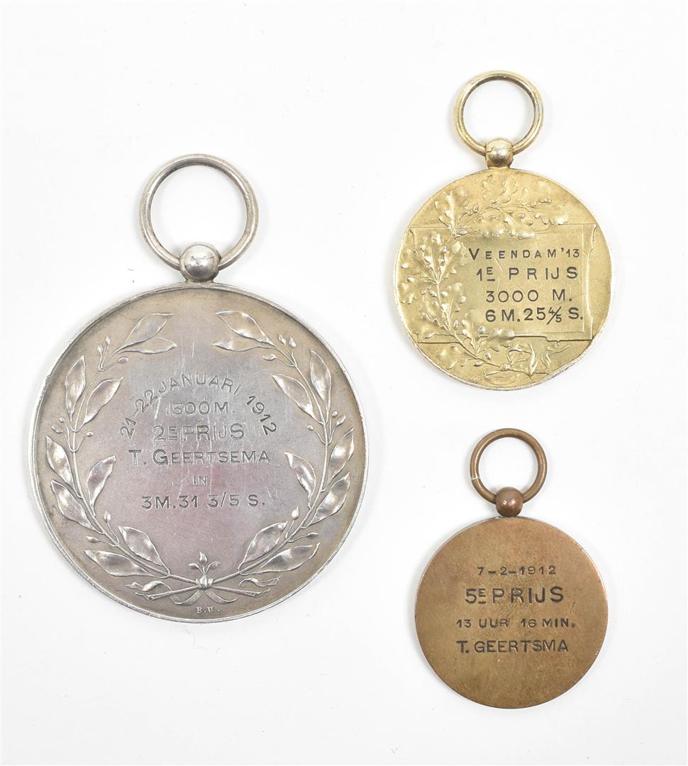 De Friesche Elf Steeden. '7-2-1912'. 5e prijs. 13 uur, 16 min. T. Geertsma*. Diameter 27 mm. (2) 1st Prijs 3000m. Veendam '13. (3) Silver medal De IJsclub Leeuwarden 21-22 januari 1912. 1500 m.
