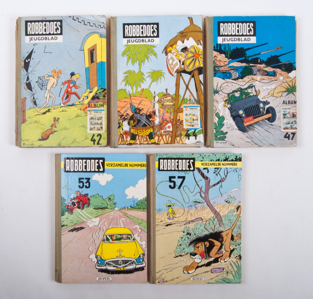 Dupuis, 1952-1956. Bundlings of Robbedoes Weekblad. Nos. 42, 44, 47, 52 and 57. No. 42 dam. top and bottom spine, else all in good condition.