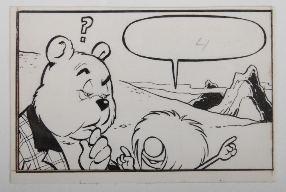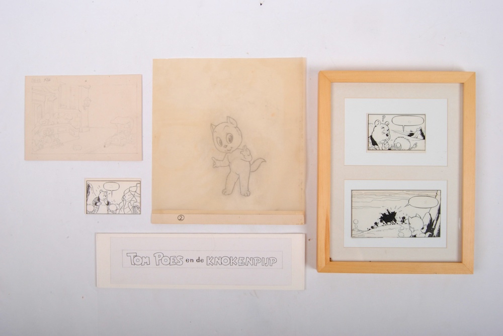 Toonder Studios, '60s. 3 drawings from the story Tom Poes en de Schemerbergen. Indian ink (from 8,5 x 5 to 12,5 x 6,5 cm.) + Pencil sketch of the Oude Schicht in front of the Stadshuis in Rommeldam, undated. Caption DD(=Donald Duck) 13, p. 32 (12 x 17 cm.)+ Pencil sketch of Tom Poes (12 x 8 cm.) and the title lettering of Tom Poes en de Knokenpijp.