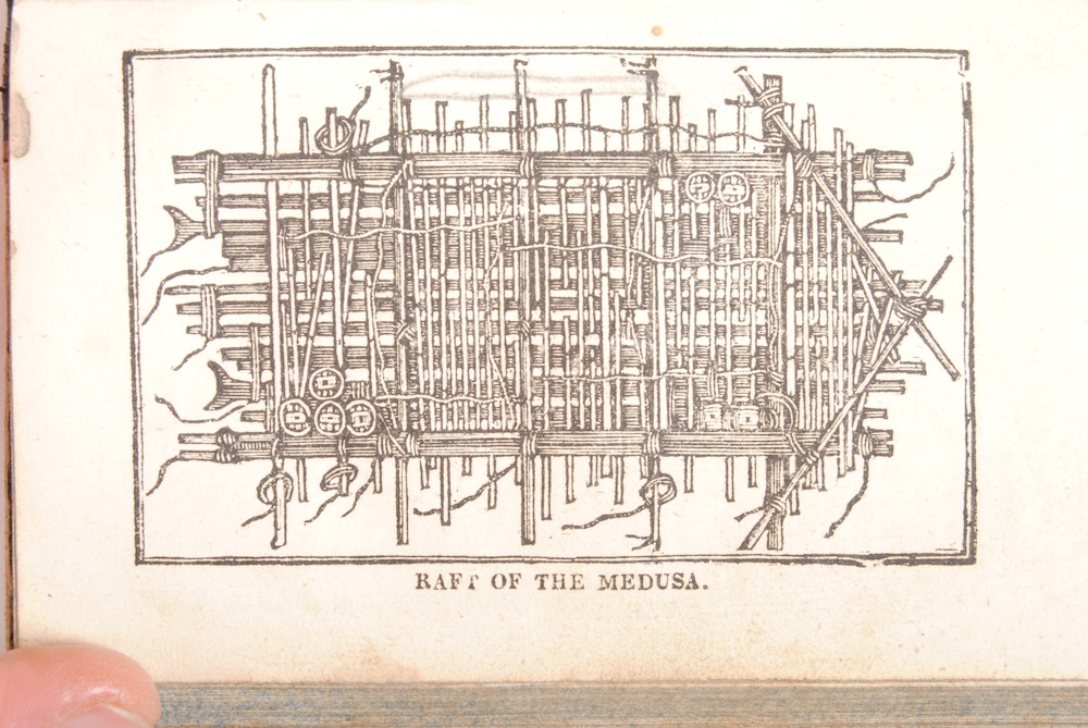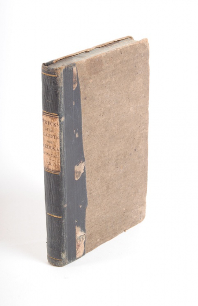12mo., VI,178 p., 2 parts in one volume, numbered throughout, incl. 6 wood engr.; first part is about the Alceste shipwreck near the Loo Choo islands, and the second page from p. 100 about the Medusa shipwreck on the Bank of Arguin off the West African coast. Half leather with cased boards and title on spine, ink stains inside front and back, last endpaper missing.