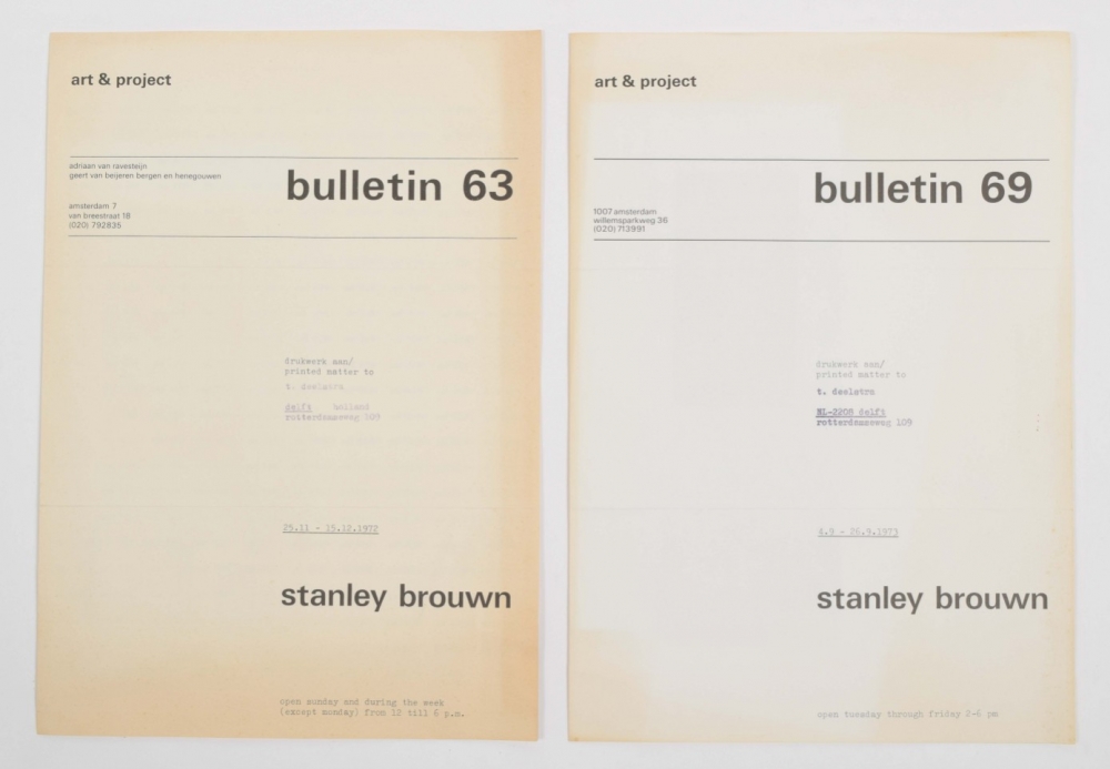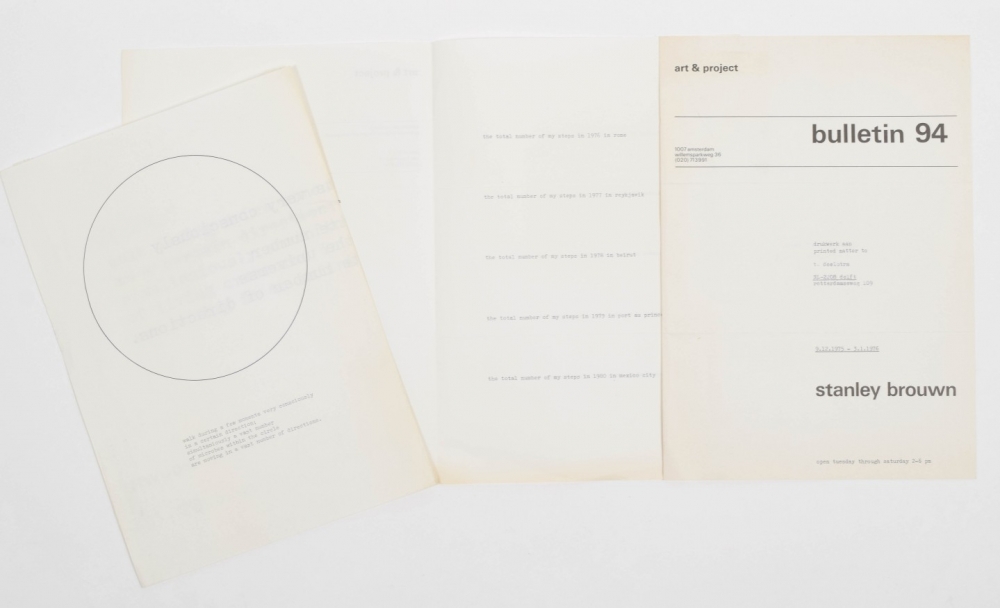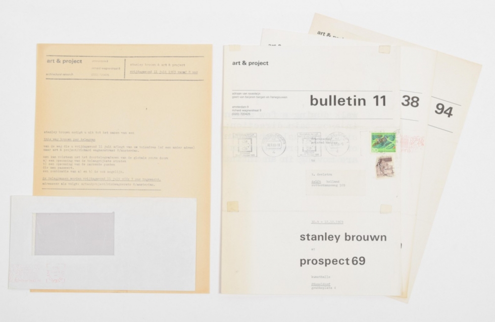 + Bulletin 63. Stanley Brouwn 25.11- 15.12 1972. Browning along edges, some creasing. Includes envelope. + Bulletin 69. Stanley Brouwn 4.9 - 26.9 1973. Browning. + Bulletin 94. Stanley Brouwn. 9.12 1975 - 3.1 1976. Some browning and creasing, else fine. Plus envelope. + Invitation sheet and instructions on how to join Brouwn's project 'This way Brouwn per telegram', July 11 1969. 29.5 x 21 cm. Text in Dutch. Very good copy. (total 6)