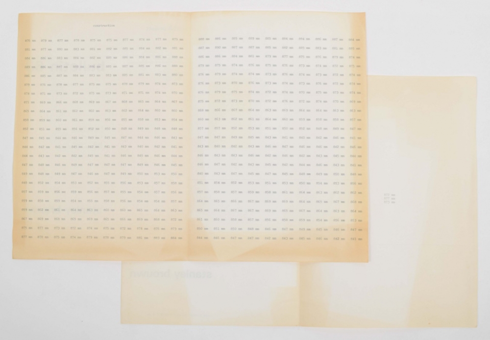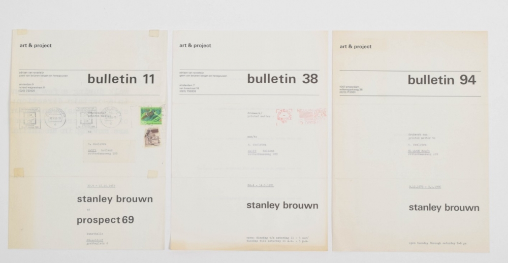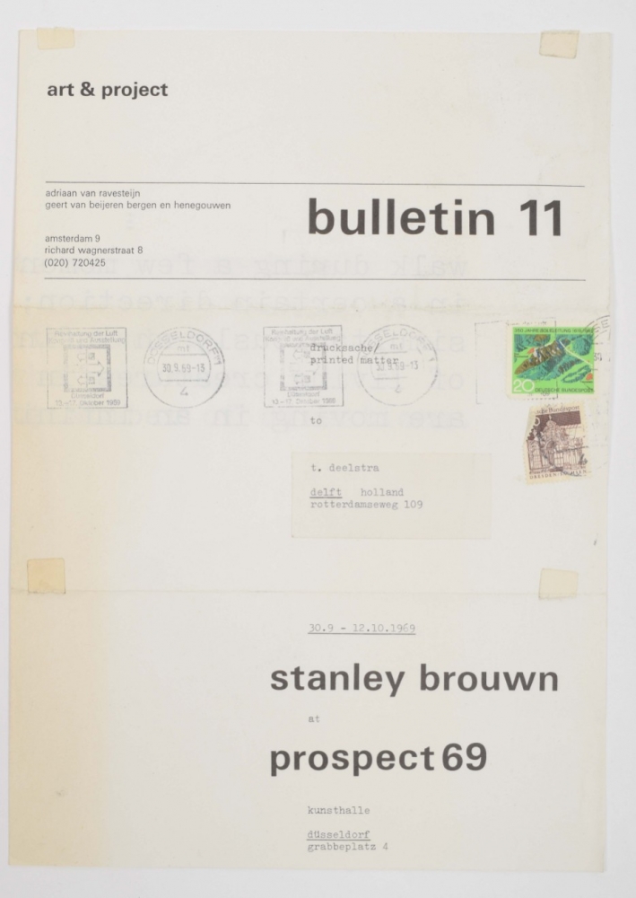 Five Bulletins. Each single folded sheet. 29.5 x 21 cm, 4 pp. Includes: Bulletin 11. Stanley Brouwn at Prospect 69. Some soiling and various stamps on front page, inside fair. + Bulletin 38. Stanley Brouwn 24.4 - 14.5 1971. Bottom edges browned, some creasing.