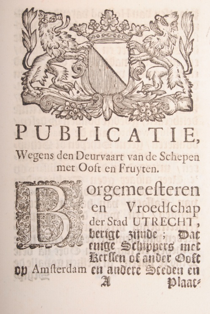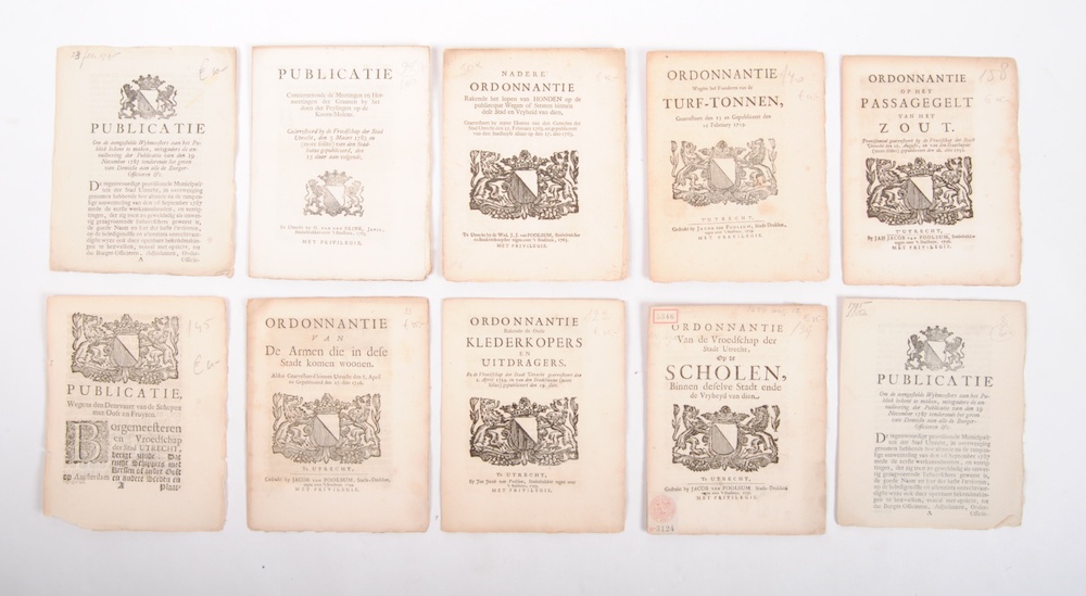 Ordonnancie van de Vroedschaap der Stadt Utecht op de Scholen, binnen deselve stadt en de Vryheyd van dien, Utrecht, Jacob van Poolsum, 1736, 8 p., printer's mark in woodcut, stamps and number, partially cut loose, good + 5 other ordinances: Klederkopers, Armen, Zout, Turftonnen, Honden + 4 publications of the city of Utrecht, all 18th century.