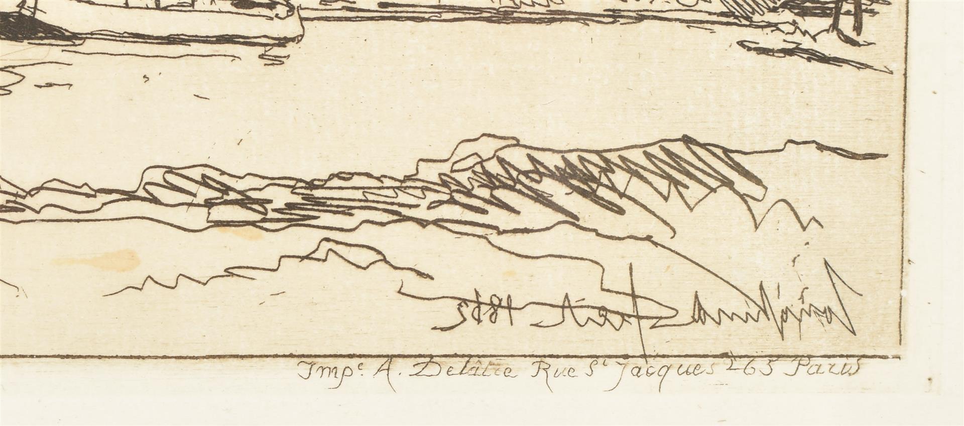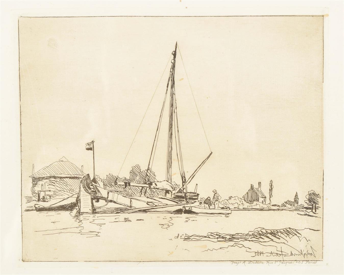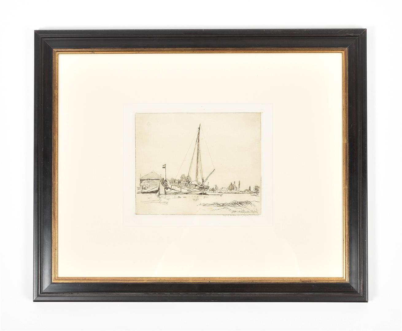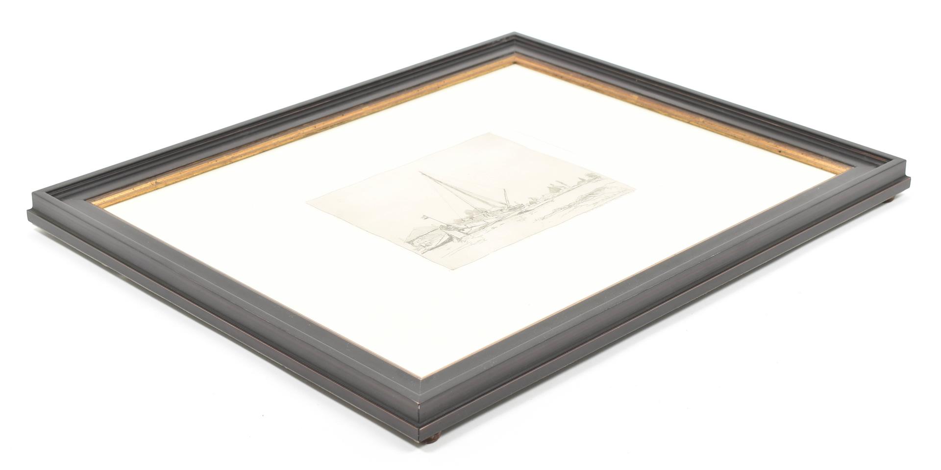 ('The moored Vessel.' Title Rijksmuseum). Etching. Paris, Auguste Delâtre, 1862. Signed and dated (mirrored) in the plate lower right. Plate size 17.6 x 21.5 cm. Framed under glass in passe-partout by Lijstenmakerij Monart. Total size 44.5 x 54.5 cm.