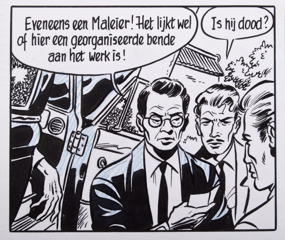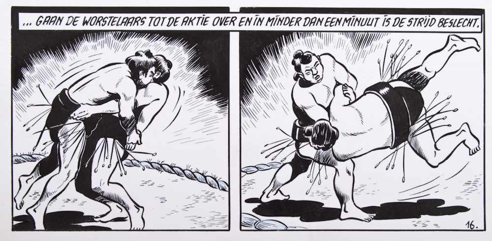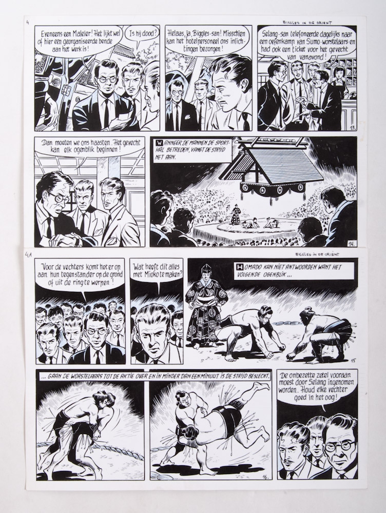 Biggles in de Orient, 1966. Original page in Indian ink consisting of 2 parts. Biggles attends a Sumo match in order to investigate a murder. 47 x 34 cm.