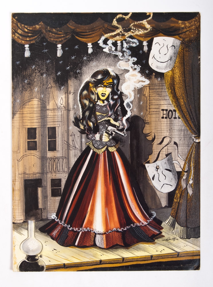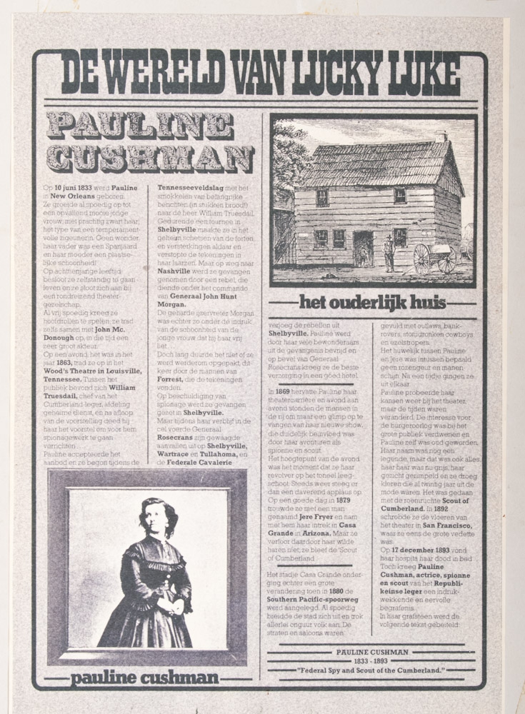 Pauline Cushman- uit de Wereld van Lucky Luke, Oberon, 1980, p. 20. Original gouache of Pauline Cushman, legendary actress of the Wilde West, spy and Scout of the Cumberland. 45,5x 33 cm.