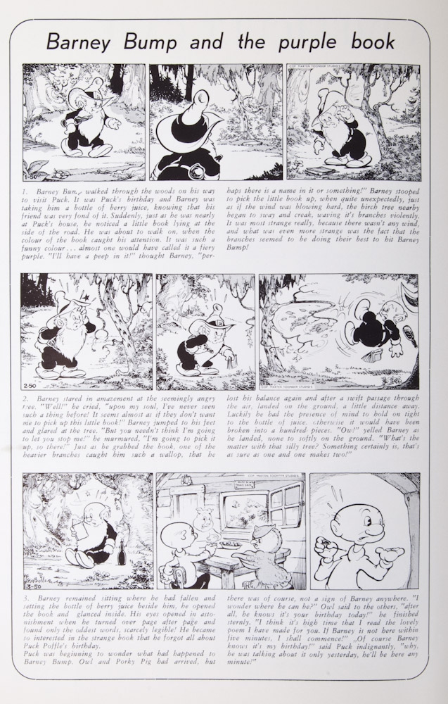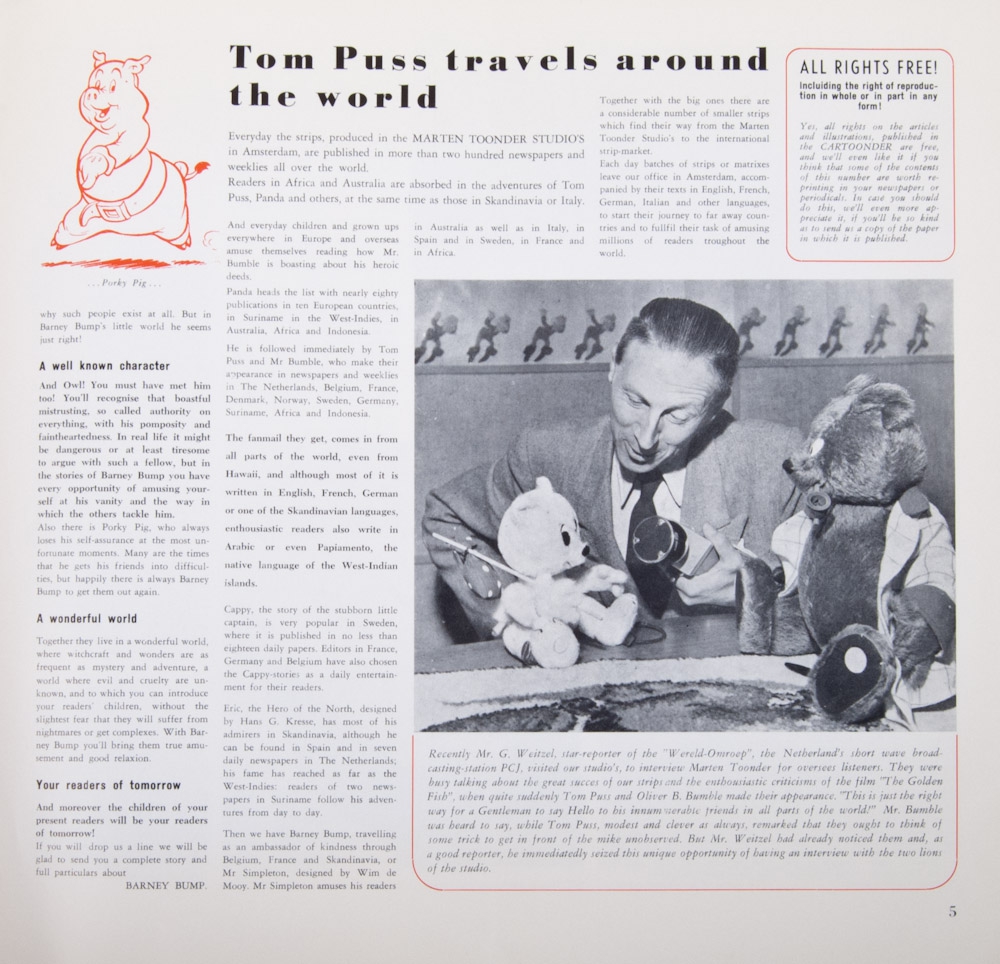 Toonder Studios, 1952. 8 p. On front "We all wish our readers a merry Xmas and a happy new year" picture with panda, Olle Kapoen, heer Bommel, Sim en Pam, Bul Super and Eric de Noorman, et al. Incl. an article on The Golden Fish- and Han van Gelder.