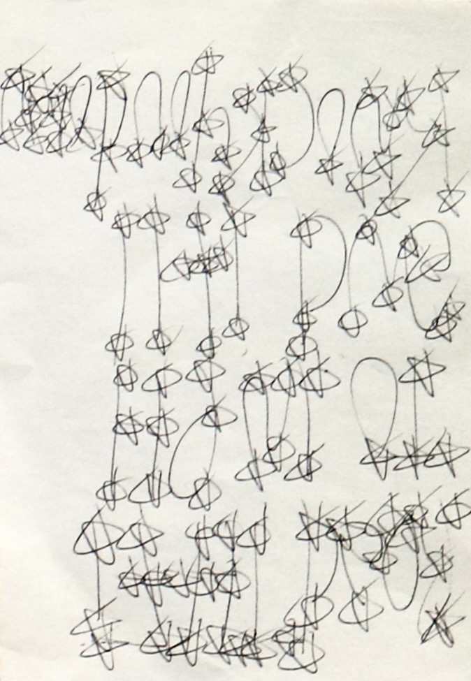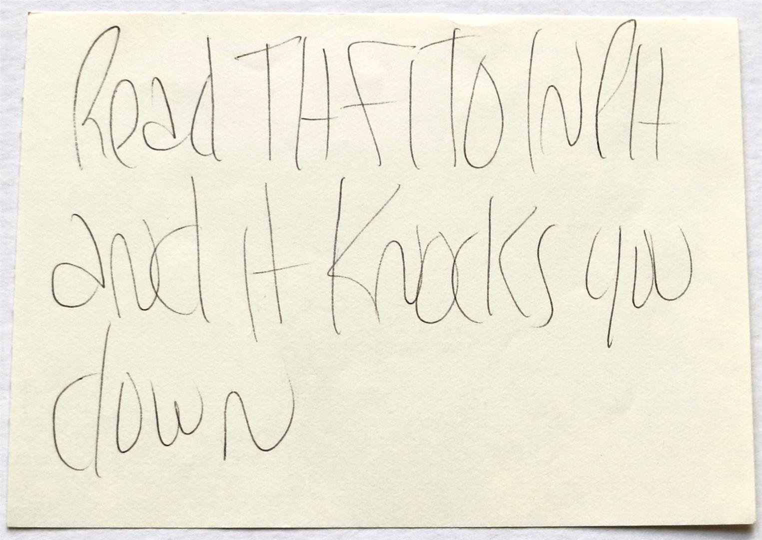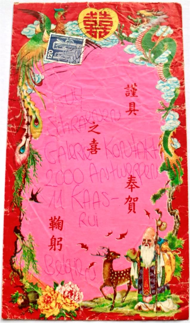 2) Read the Th.FI.TO.IN.PH (the first totally interrogative philosophy) and it knocks you down. Handwritten note, black ink on white sheet, 11.5 x 8.2 cm. (3-5) Three handwritten letters, black ink on white sheets, 33.5 x 24.5 cm, 29.5 x 21 cm, and 11.5 x 8.5 cm. (6-8) Three empty mailed envelopes addressed to Guy Schraenen, including a floral Chinese paper envelope, postmarked 1976. Provenance: collection Guy Schraenen. (total 8)