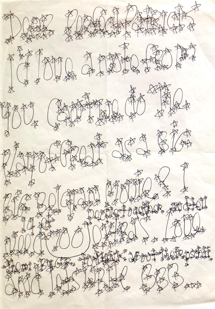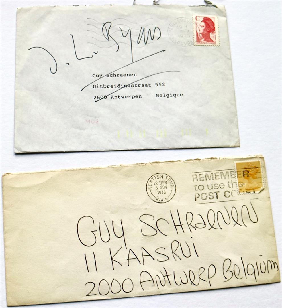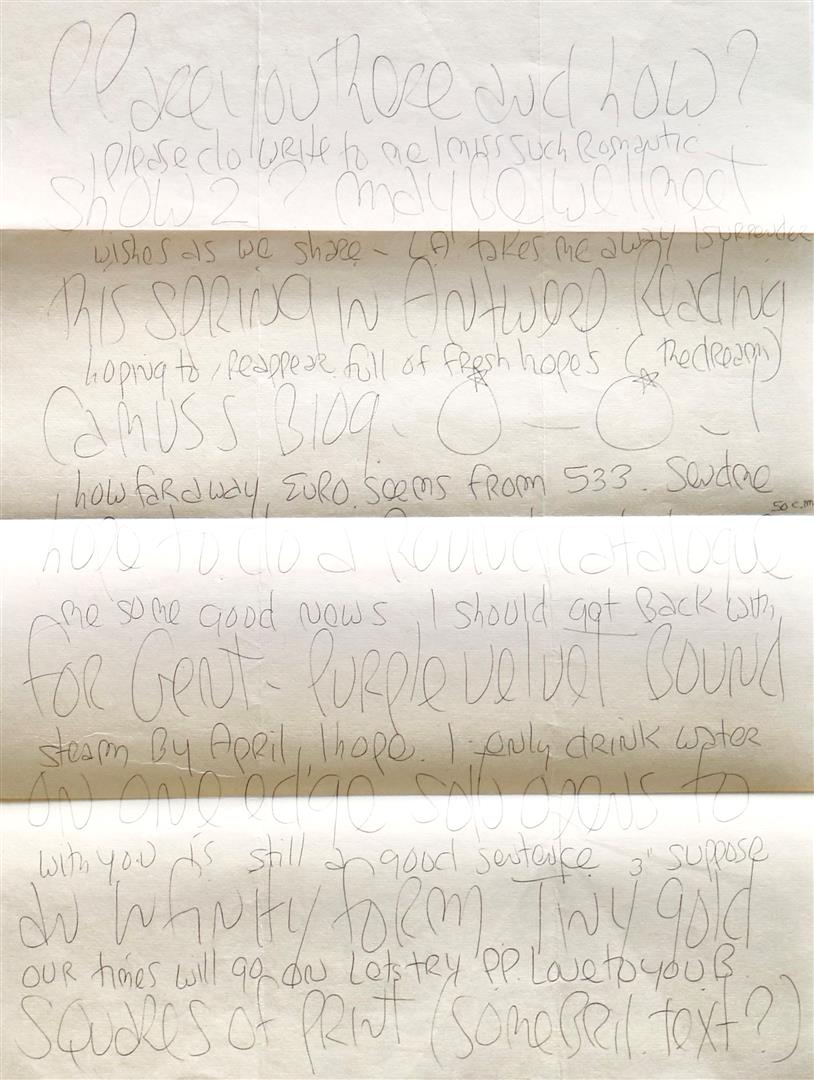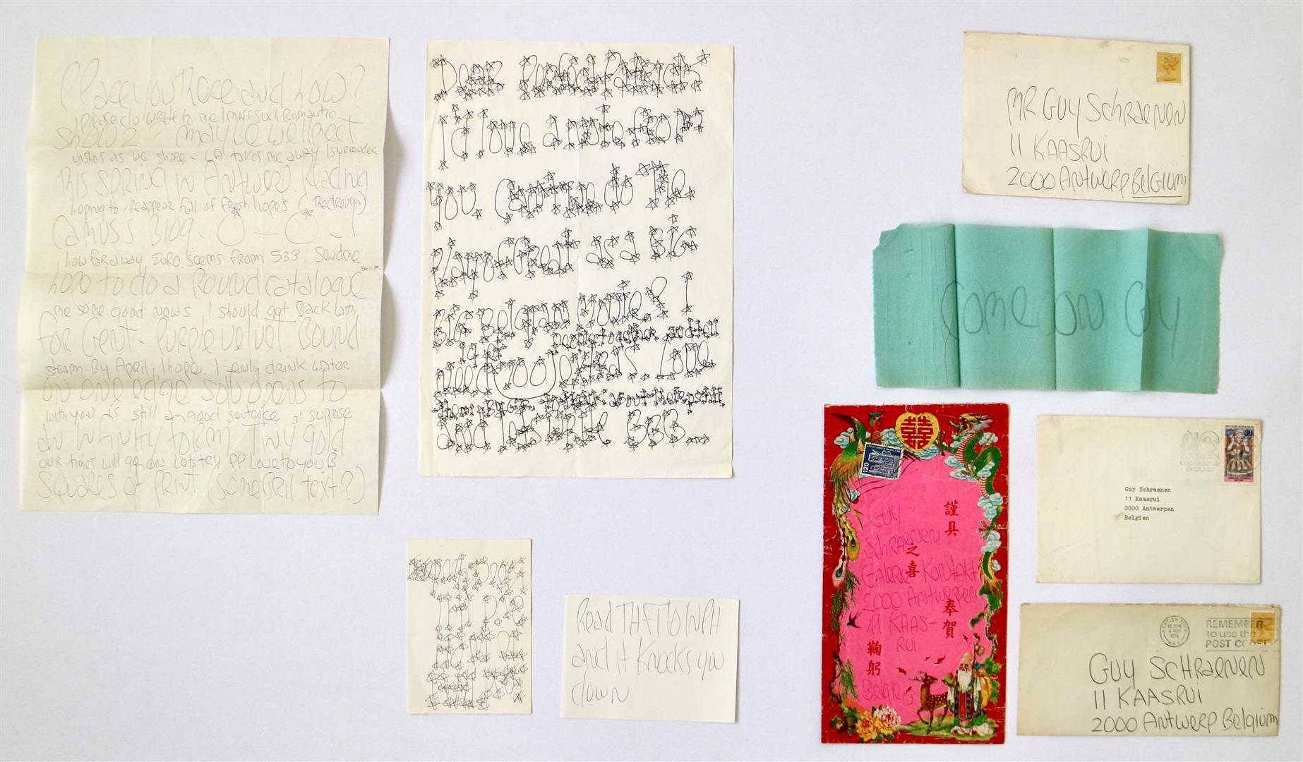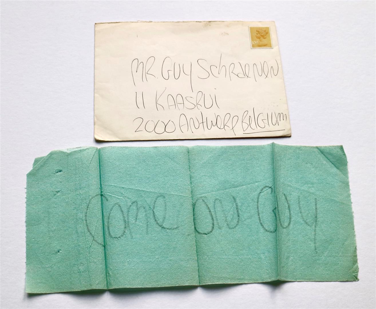 1) Come on Guy. Hand-written letter on green toiletpaper, 11.5 x 26 cm, with original envelope addressed to Mr. Guy Schraenen sent from Krauss, Dusseldorf. Text on verso of envelope states 'How about a visit to Antwerp to get it done Got a room? Money? (freely transcribed).