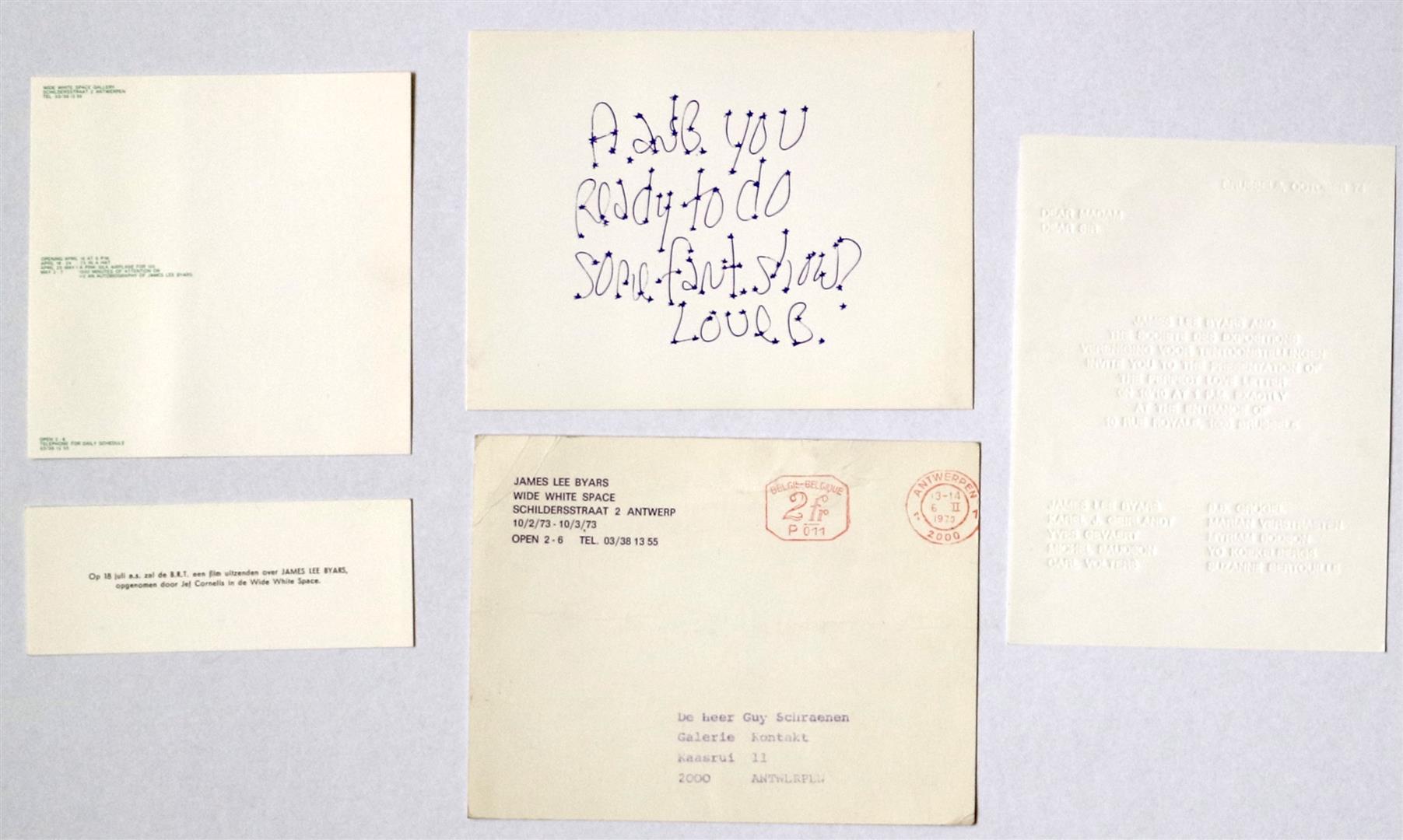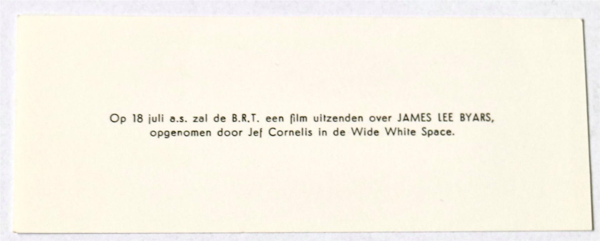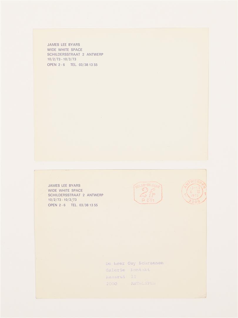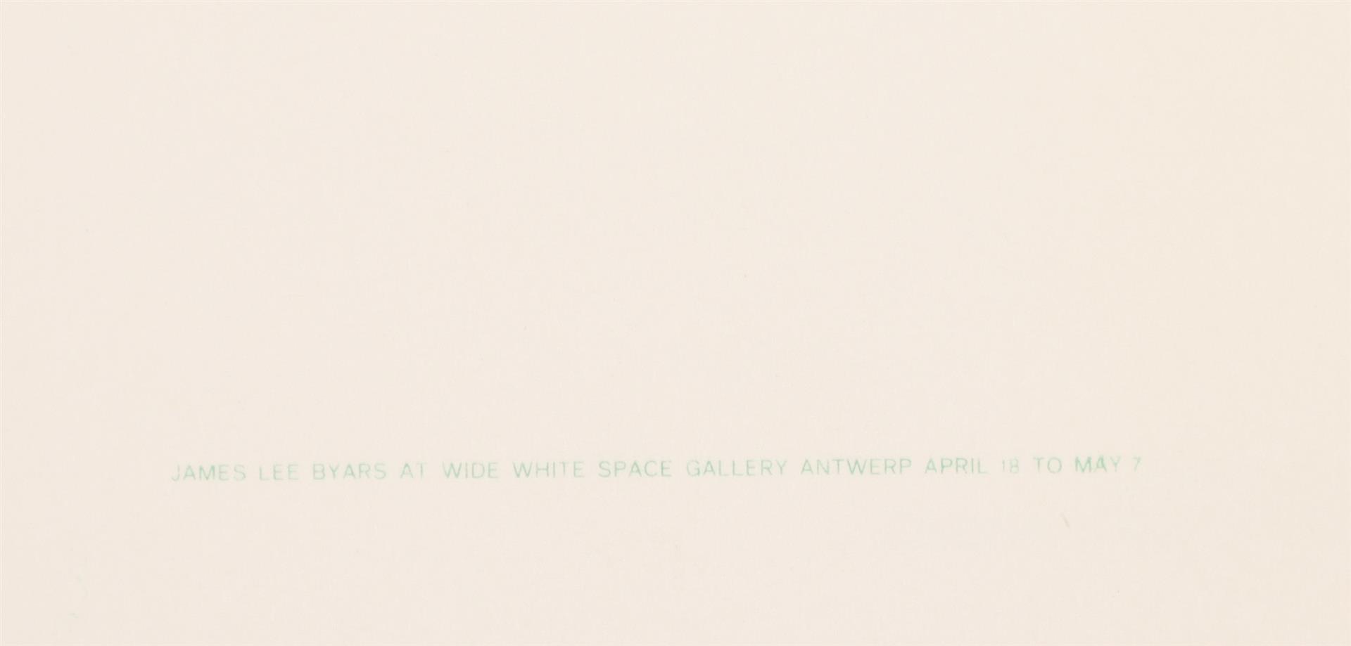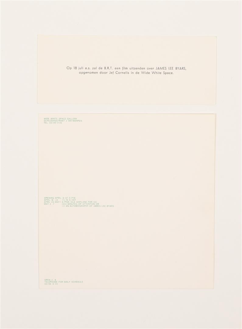 (1) James Lee Byars at Wide White Space Gallery Antwerp. April 18 to May 7 1969. White card, 12 x 12 cm. Printed both sides with extremely small text in green. Announces the works '75 In A Hat', 'A Pink Silk Airplane for 100', '1000 Minutes of Attention or 1/2 An Autobiography of James Lee Byars'. (2) Announcement for a B.R.T television broadcast on July 18 1969 featuring a film about JLB shot by Jef Cornelis at Wide White Space. White card, 4.6 x 12 cm, printed in black.