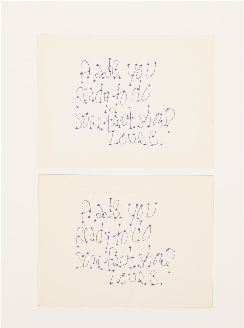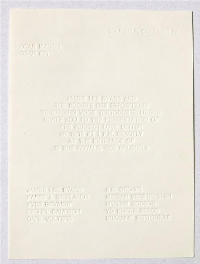 (3-4) A and B you ready to do some Fant. Show? Invitation card for the exhibition held from 10 Feb - 10 March 1973 at Wide White Space Antwerp. White card, 12 x 15.7 cm, recto printed with ornate hand written text in purple. Verso shows gallery information. Two copies are added: one unmailed (mint), one addressed to Guy Schraenen with some creasing. (5) Invitation to the presentation of The Perfect Love Letter at the Societé des Expositons in Brussels on Oct 10 1974 at 1 PM. Exquisite white card with embossed text, 16 x 11.8 cm. (total 5)