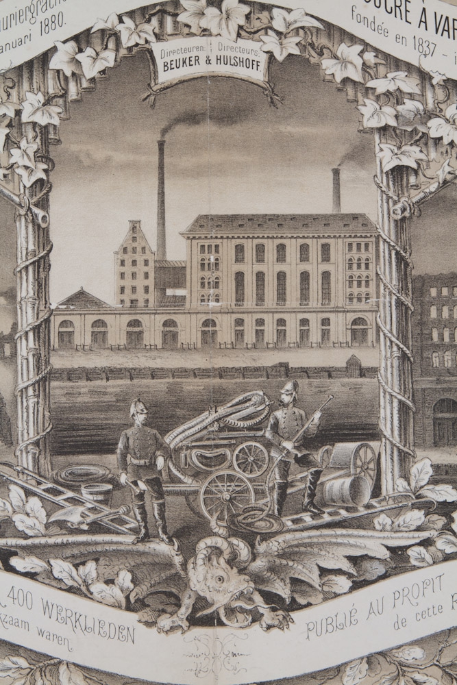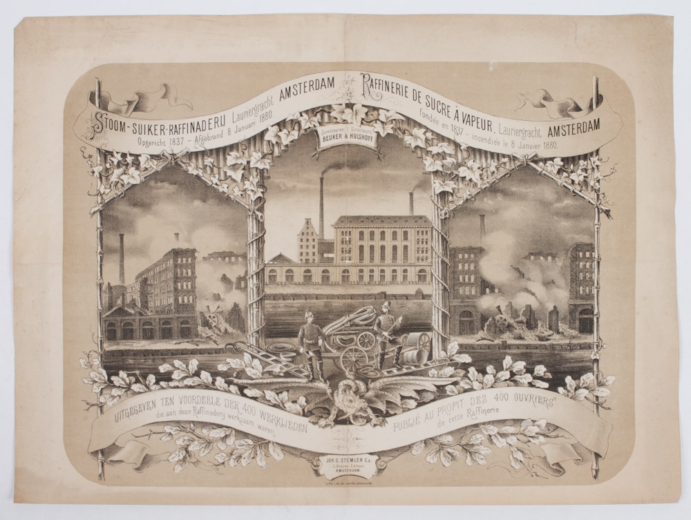 Uitgegeven ten voordeele der 400 Werklieden die aan deze Raffinaderij werkzaam waren. Joh. G. Stemler Cz., Amsterdam. Lith. I.M. de Vries, Haarlem, 1880. 48 x 64 cm.