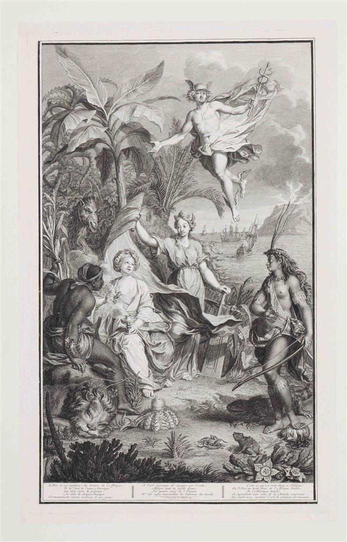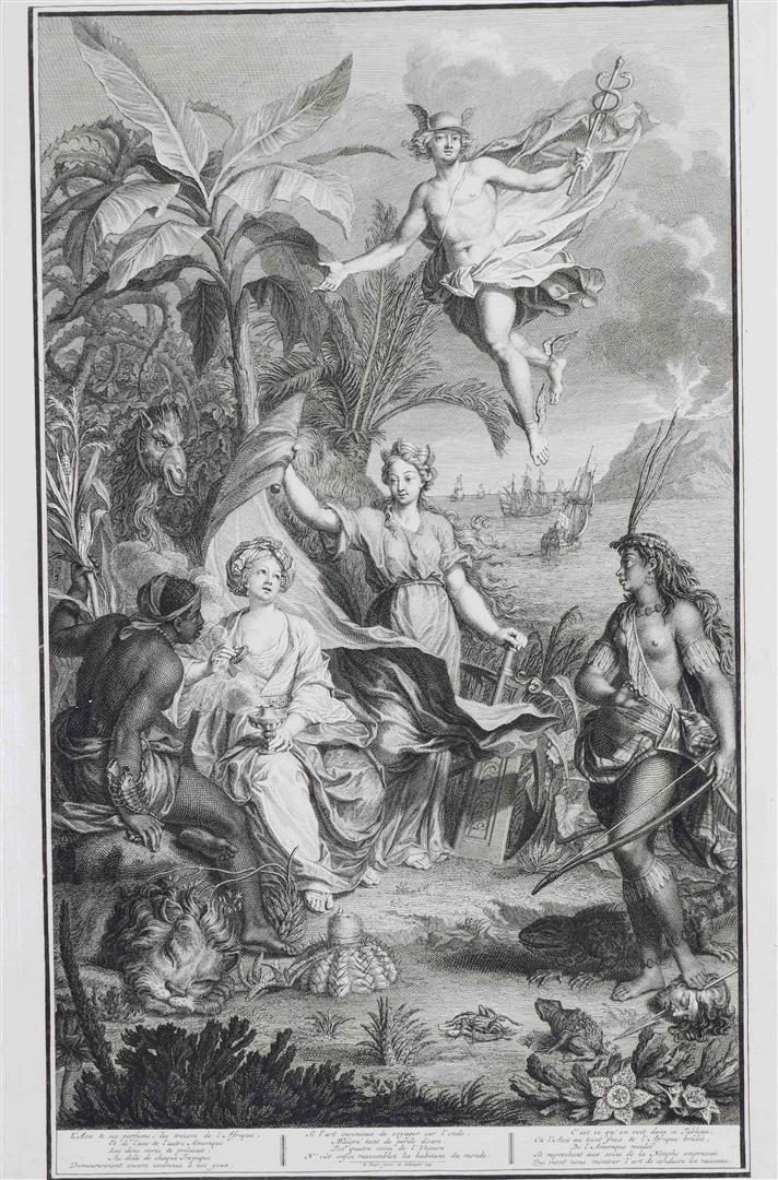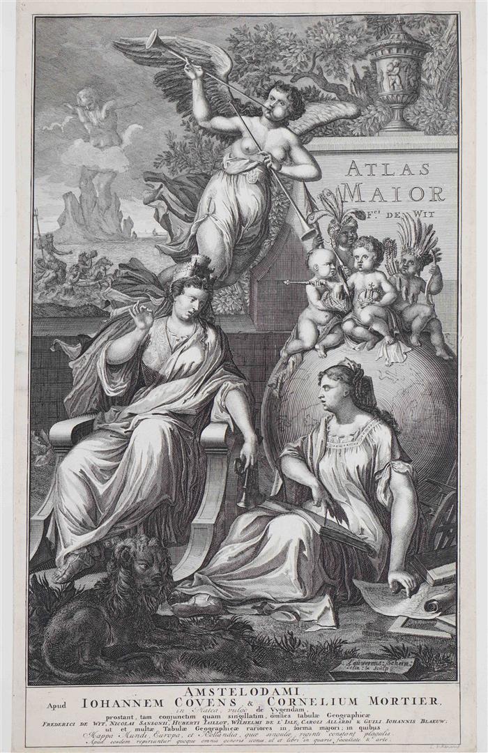 published of Frederik de Wit). Engraving, 46.5 x 27.5 cm, w. the address of J. Covens and C. Mortier in lower margin, early 18th cent., mounted at upper margin. Smoothed-out central horizontal fold. Good copy. (2) Bernard Picart (1673-1733). (Allegory on the parts of the world). Engraving, 40 x 24 cm, dated 1719, mounted at upper margin. Printed on very thin (Japan) paper, creased at the top. With the collector's mark of Christiaan Kramm (1797-1875) (Lugt L.581) verso. -and 5 others.