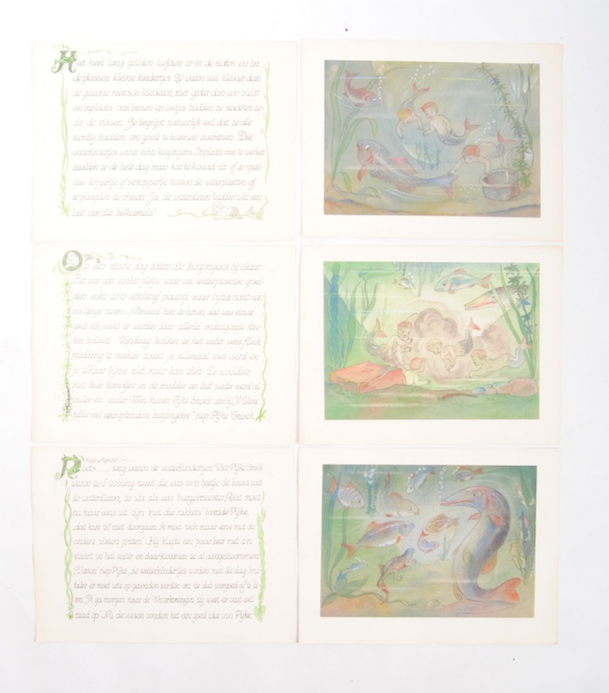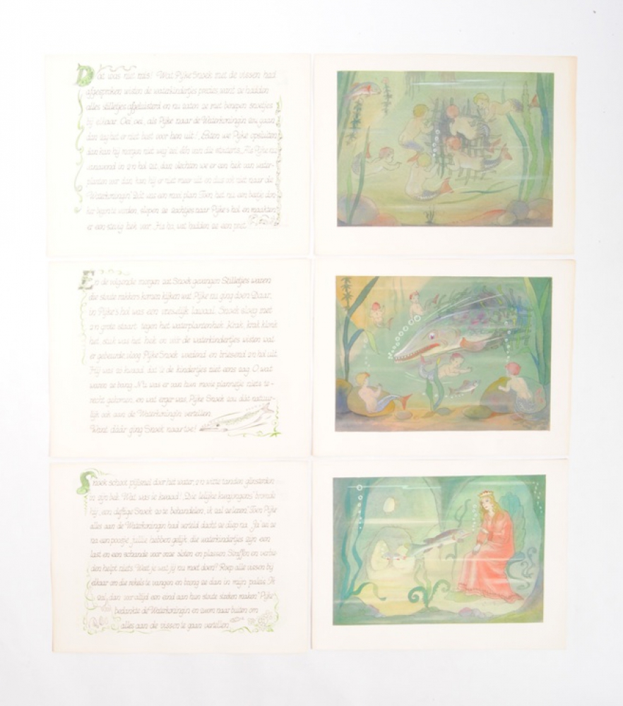 By Tom Nye, ca. 1935. Complete manuscript for an unpublished book, with 10 + 1 (=title page) watercolours in the text and 10 text pages with drawn ornaments. Size watercolours 27 x 19 cm.