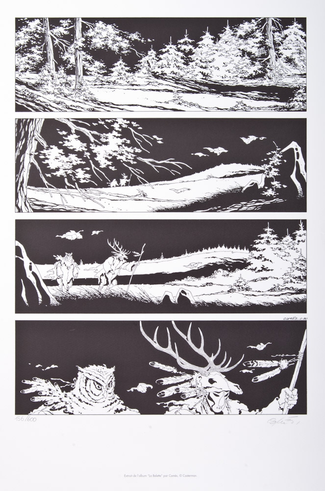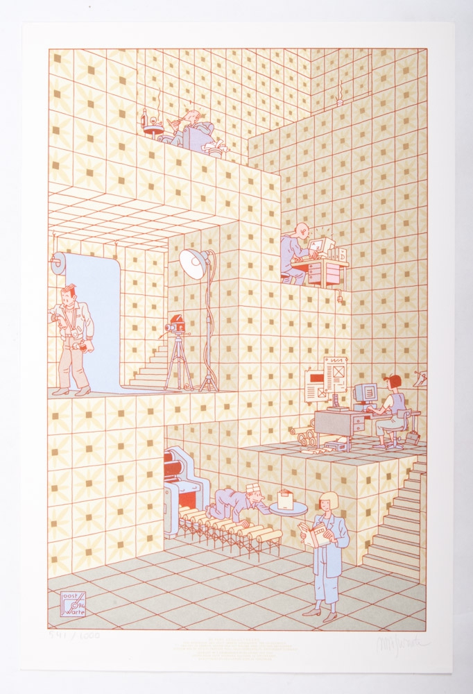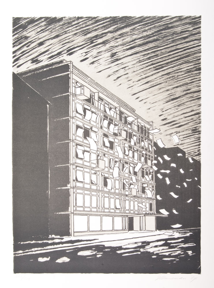 De Pers Geïllustreerd. Screen print, published for the opening of the new Geïllustreerde Pers building, 1994. No. 541/1000, signed. 60x40 cm. + Jeroen Henneman (1942-) Kantoor in de wind. 302/500, 1987. Screen print 61 x 47 cm. - and 1 other.