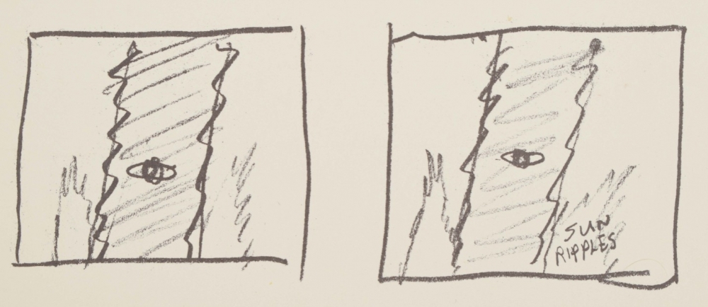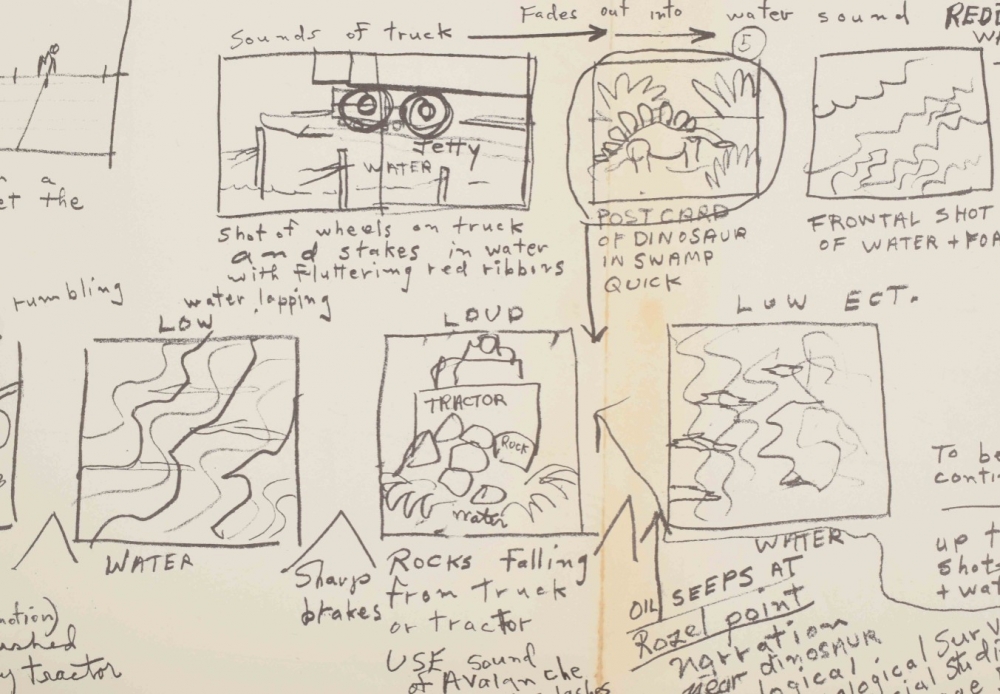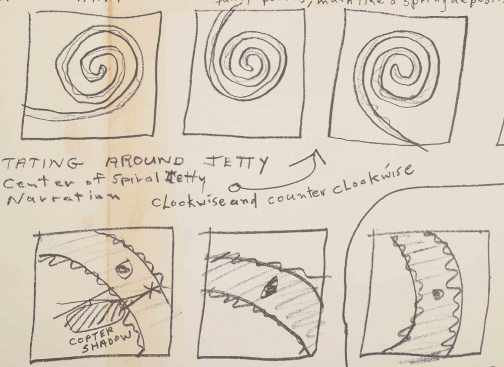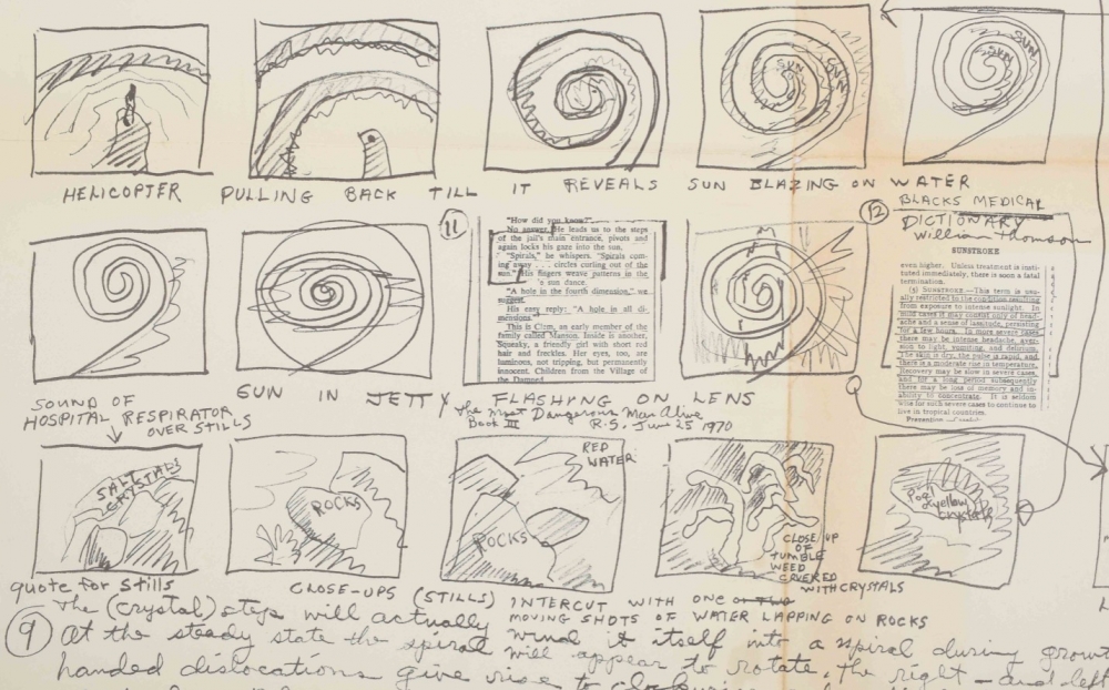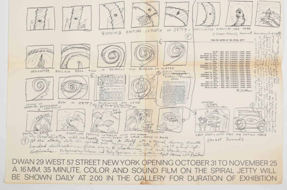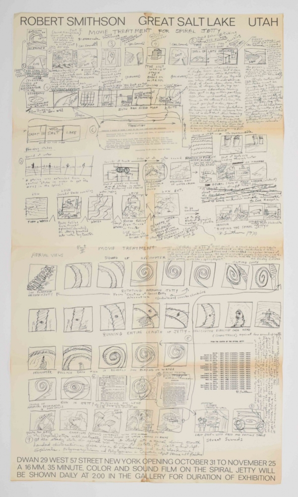 Features the storyboard for the film about his now famous land art sculpture, Spiral Jetty. Browning and creasing around folds. Small brown stains and two tiny rips (5 mm) along the vertical fold. Aged, yet remarkable item.