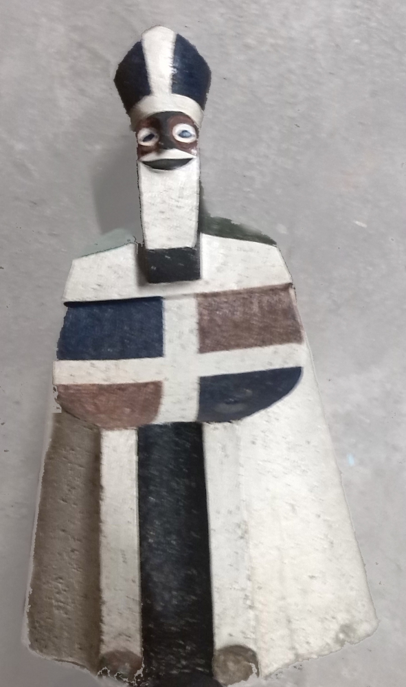 Ceramic, Russel Tiglia, presumably made by Frans Tuinstra, ca. 1960. Intended for the St. Nicholas promotions in the Bijenkorf branches that year. No other remaining copies known. Two holes in lap in which an advertising board could be inserted. 100x35x35 cm. In white blue and red.