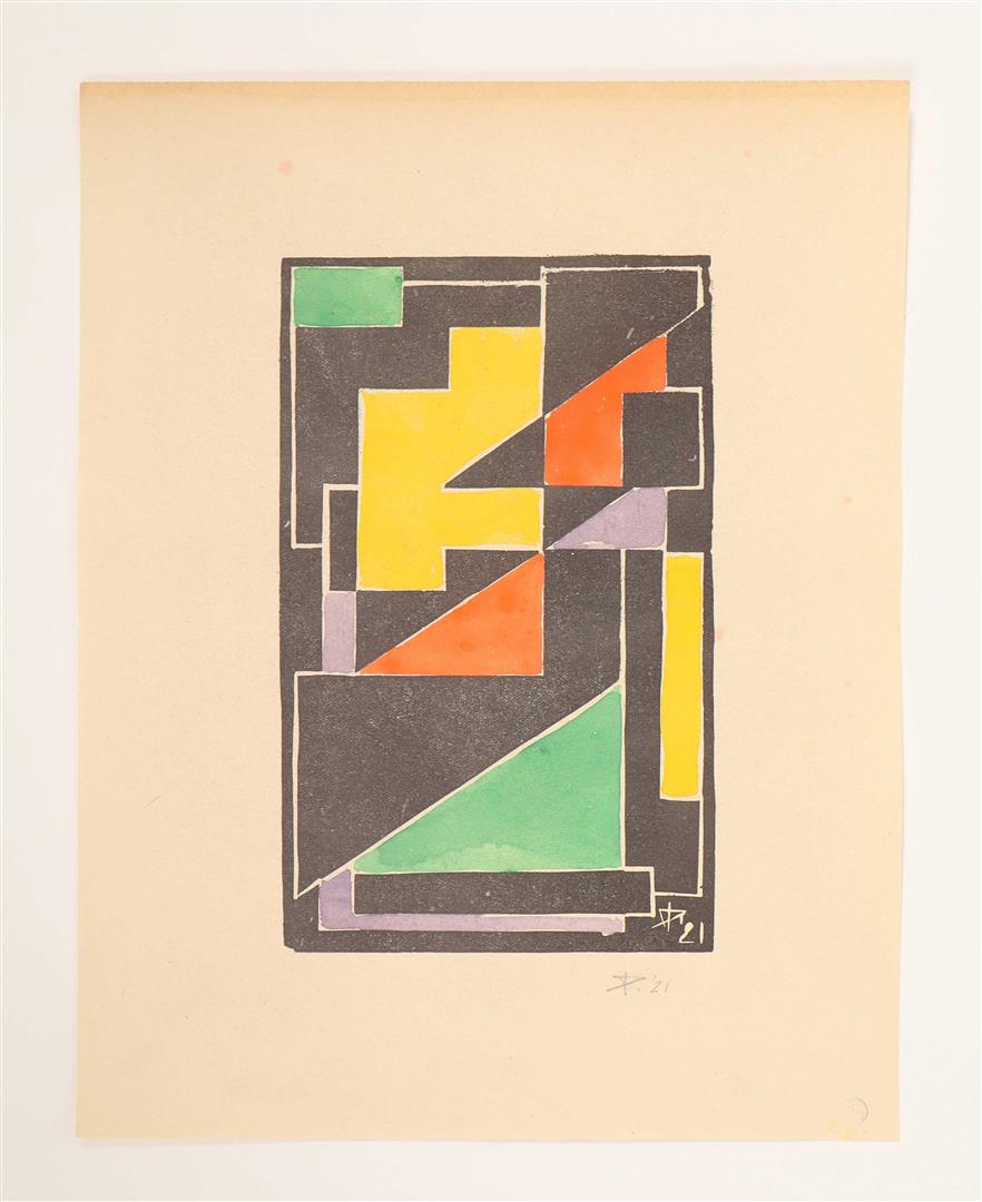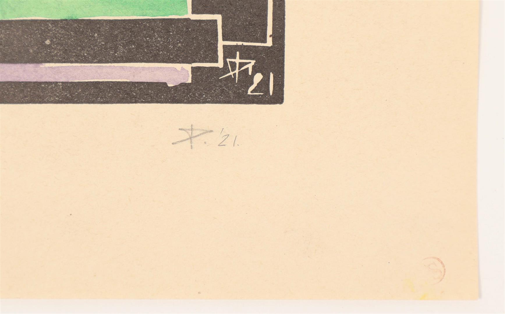 Hand-col. linocut, 1921. Published as ill. for periodical 'Ruimte', 1922. Monogrammed and dated in pencil at lower right and within the image. Image: 10.2 x 16.5 cm; sheet: 25 x 19.5 cm.